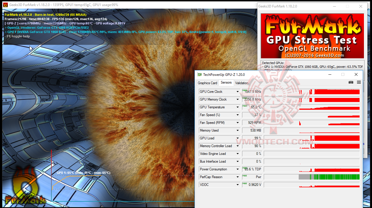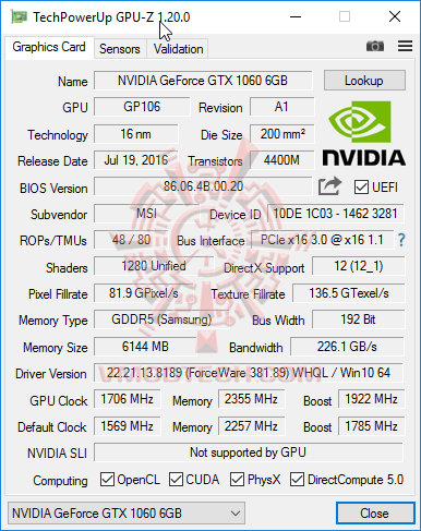 MSI GeForce GTX 1060 GAMING X PLUS 6GB OC @ 1706/2355/1922 MHz Core/Mem/Boost
