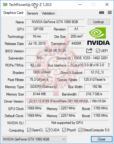 MSI GeForce GTX 1060 GAMING X PLUS 6GB from GPUZ