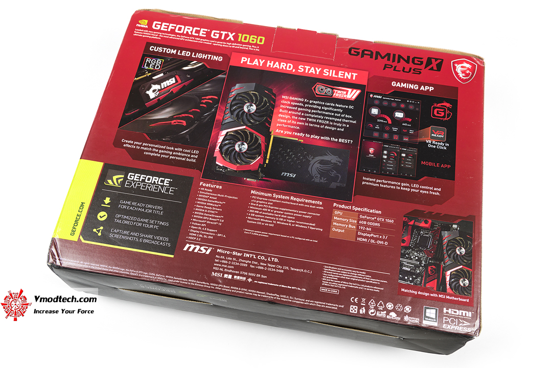 หน้าตาของตัวกล่องบรรจุ MSI GeForce GTX 1060 GAMING X PLUS 6GB นั้นได้ถูกออกแบบมาได้จี๊ดจ๊าดสะดุดตามากๆครับ รายละเอียดและเทคโนโลยีต่างๆดังที่กล่าวไปแล้วก็สามารถชมแบบสรุปได้จากหลังกล่องเช่นเคย
