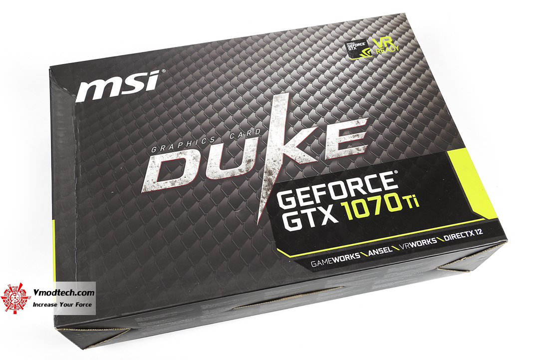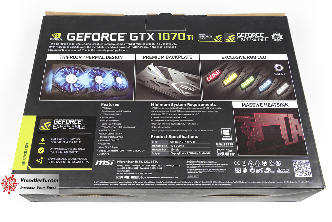 MSI GeForce GTX 1070 Ti DUKE นั้นมาพร้อมกับแพกเกจลักษณะมาตรฐานที่สวยงาม ด้านหลังของกล่องจะมีรายละเอียดของตัวการ์ดให้ได้พิจารณากันอย่างครบถ้วน
