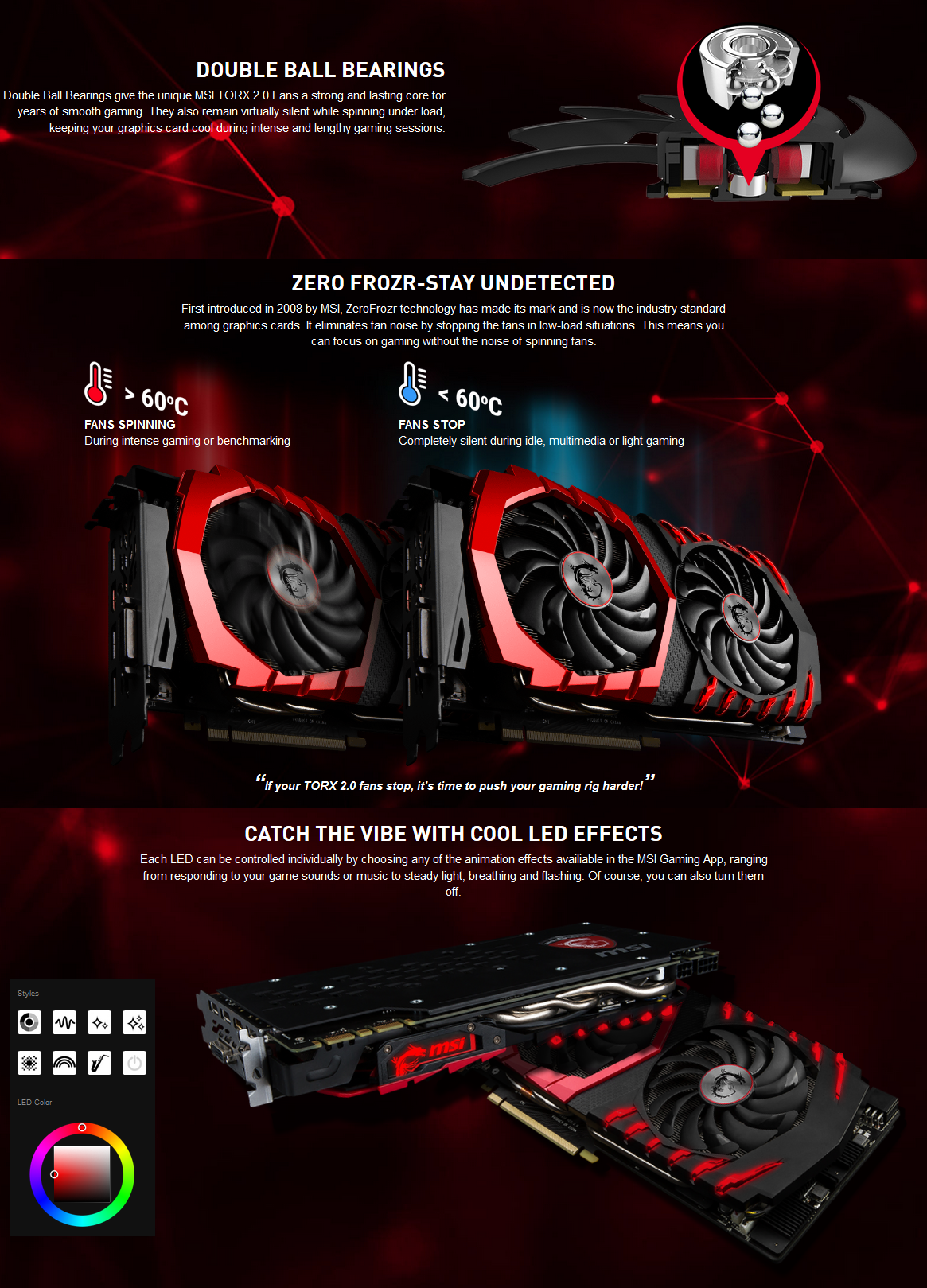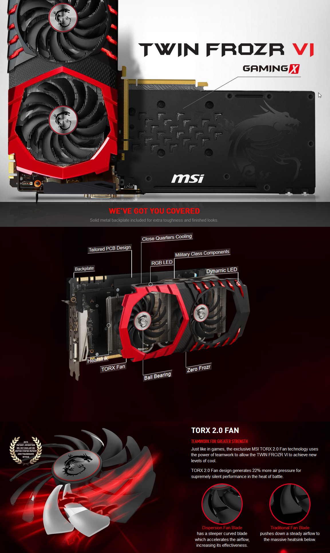 ด้วยชุดระบายความร้อน TWIN FROZR VI ที่เคยได้รับรางวัลมาแล้วจะช่วยยกระดับความเย็นของกราฟฟิกการ์ดด้วยลม TORX Fan 2.0 นั้นเป็นเทคโนโลยีรุ่นที่สองของเทคโนโลยี MSI TORX ที่มีสิทธิบัตรซึ่งจะสร้างแรงลมได้มากกว่า 22% เพื่อให้สมรรถนะที่สูงกว่าและช่วยลดเสียงรบกวนได้ดีกว่า มันได้ถูกต่อเชื่อมกับฮีทซิ้งค์ขนาดเขื่องที่ทำมาจากท่อทองแดงสี่เหลี่ยมจัตุรัสหนา 8 มิลลิเมตรที่ด้านล่างเพื่อส่งเสริมการส่งผ่านความร้อนจากแผ่นนิคเกิลผสมทองแดงและเมื่อรวมเข้ากับซิลิโคน Thermal Compound X นั้น จะช่วยให้คงความเย็นให้กับ GPU ได้ดีกว่า