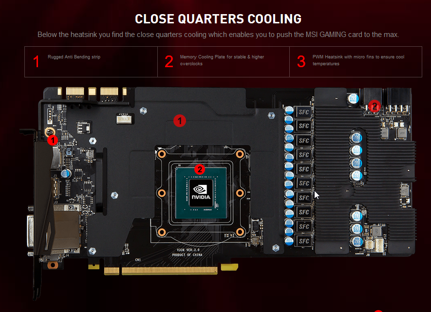 กราฟฟิกการ์ด MSI GeForce GTX 1080 GAMING X PLUS 8GB นี้ได้ถูกติดตั้งชุดระบายความร้อน TWIN FROZR VI ที่ช่วยคงความเย็นให้กับ GPU ได้ดีอย่างที่ไม่เคยมีมาก่อน ด้วยชุดระบายความร้อนนี้จะทำให้ได้ความเร็วคอร์และเมมโมรี่ที่สูงกว่าซึ่งจะทำให้มีประสิทธิภาพมากขึ้นในการเล่นเกมส์ และด้วยรูปร่างที่เป็นที่เตะตาของชุดระบายความร้อน TWIN FROZR ซึ่งเกิดจากแสงไฟของโลโก้ GAMING ที่จะสว่างเรืองแสงไปพร้อมๆกับโลโก้ MSI GAMING dragon ที่ด้านข้างที่ทำการติดตั้งไฟ RGB LED เอาไว้ด้วย มันสามารถแสดงแสงสีได้มากถึง 16.8 ล้านเฉดเพื่อให้เข้ากันได้ดีกับการตกแต่งเคสหรืออารมณ์การเล่นเกมส์ในแต่ละช่วงของคุณ ด้านการออกแบบ PCB นั้น MSI คำนึงถึงการเพิ่มขีดความสามารถด้านพลังงานด้วยการติดตั้งอุปกรณ์ Military Class 4 ที่จะช่วยเพิ่มเสถียรภาพในการใช้งานให้ไปถึงขีดสุด ที่ด้านหลังของการ์ดนั้นได้ถูกติดตั้งแบคเพลทสีดำด้านไว้เพื่อเสริมภาพลักษณ์ความแข็งแกร่งและดุดันไปพร้อมๆกับผิวสัมผัสที่ยอดเยี่ยม