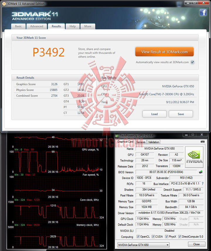 สำหรับการโอเวอร์คล๊อก MSI GTX 650 Power Edition นั้น ผมลองจากหลายโปรแกรมพอควรครับ ซึ่งไม่ว่าจะโอเวอร์คล๊อกด้วย software ตัวไหนก็จะไม่เห็นความเปลี่ยนแปลงของตัวเลข Core บน GPUZ จะเห็นความเปลี่ยนแปลงแค่ในส่วนของ Memory เท่านั้น แต่พอลอง Benchmark เพื่อดูการตอบสนองของความเร็ว Core ในขณะ Full load ดูก็พบว่า ความเร็วมันวิ่งขึ้นไปเท่ากับที่เราลากครับ อย่างในรูปด้านบน ผมลากค่านี้คือ Core/Mem 1215/1314 MHz พอเข้าไปเทส Benchmark ด้วย 11 เสร็จแล้วออกมาตรวจสอบความเร็วก็พบว่าตรงกันครับ