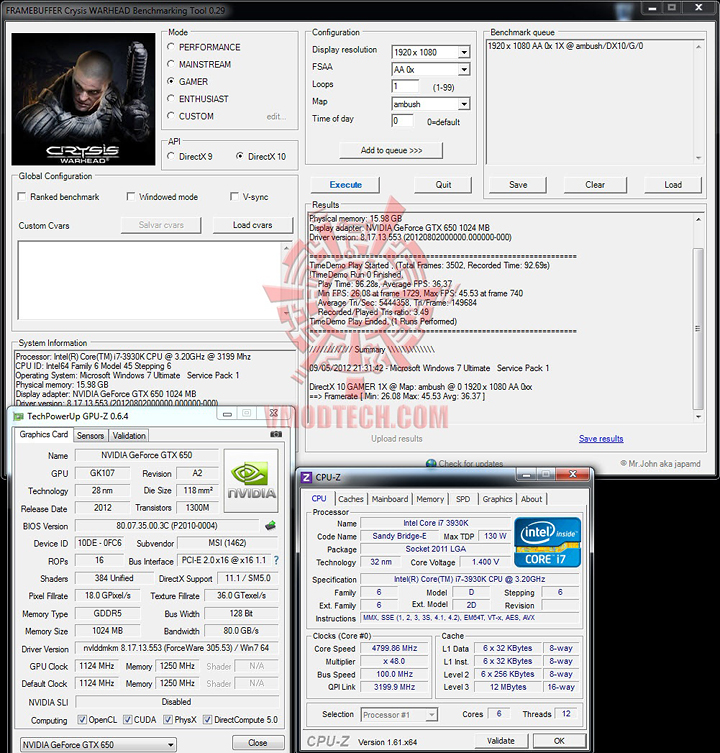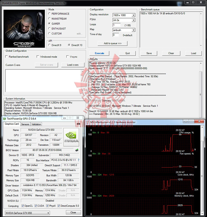 Crysis Warhead นี่เป็น DX10 ซึ่ง GTX 650 นั้นเล่นได้ลื่นมากครับในโหมดเกมส์เมอร์ที่รันทดสอบด้วย Resolution Full HD และปิด AA
