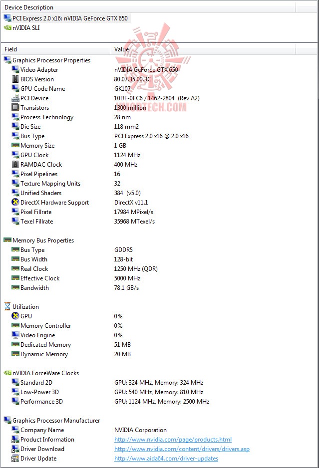MSI GeForce GTX 650 POWER EDITION Detail from AIDA 64