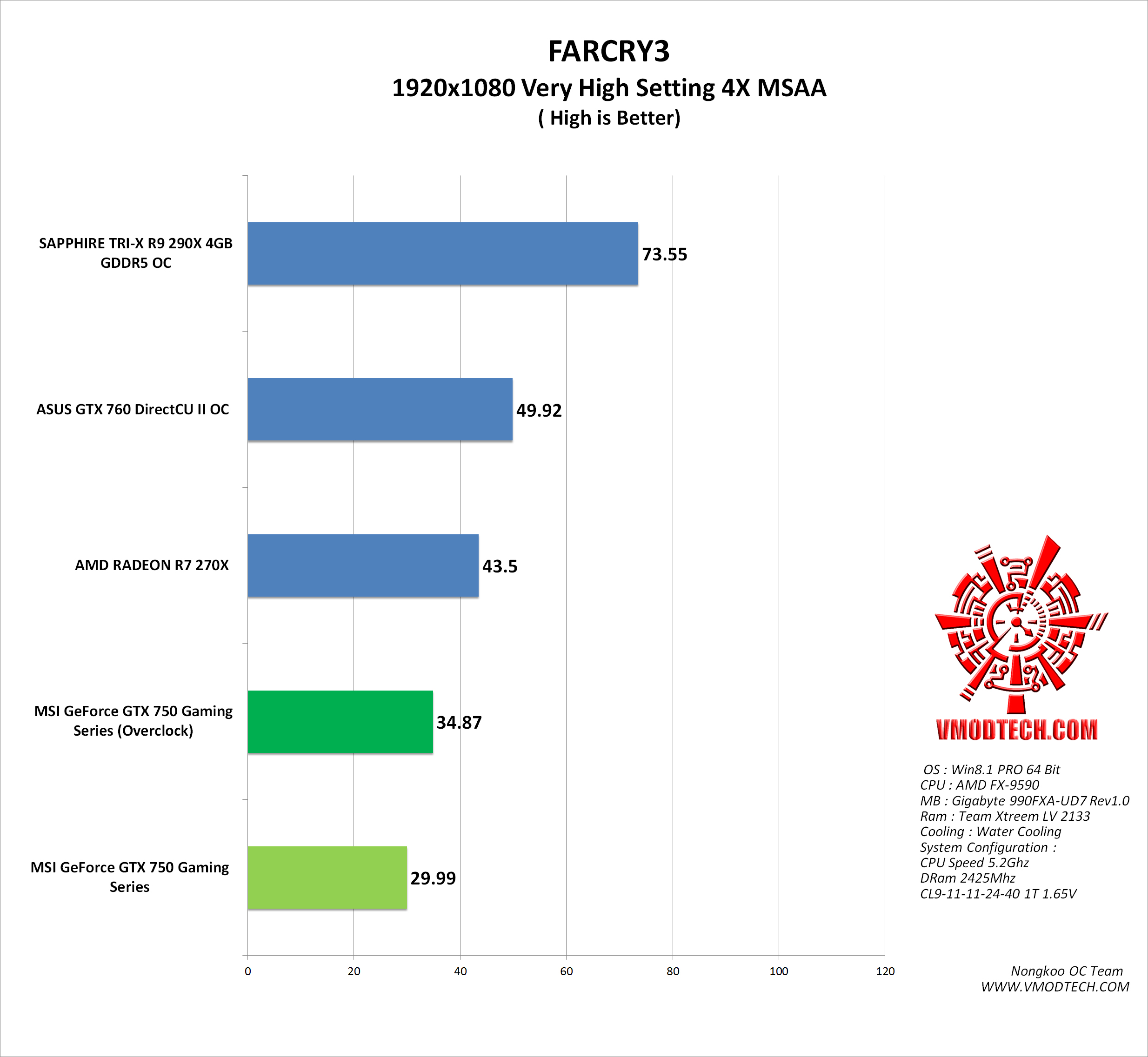 FARCRY3 ความละเอียด 1920X108 Very High MSAA 4X เฟรมเรตอยู่ที่ 34เฟรมเรต ก็ถือว่าโอเคครับ แต่มีเพื่อนสมาชิกถามว่า GTX 750 กับเกมส์นี้จะเล่นได้ลื่นขนาดไหนโดยผมได้ทดสอบแล้วใช้คอนฟิกตามนี้ครับเพียงแต่ปิด AA แล้วเทสดูปรากฏว่าลื่นไหลสุดๆครับที่เฟรมเรตเกิน 50+อย่างแน่นอน