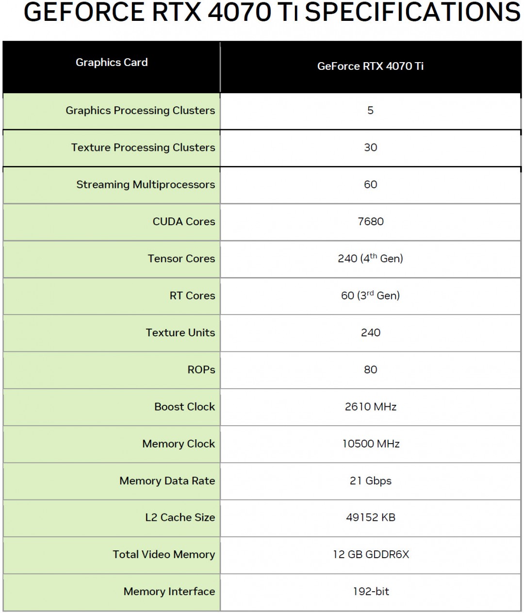 GeForce RTX 4070 Ti นั้นถูกสร้างขึ้นมาบนพื้นฐานของ GPU AD104 ซึ่งจะอัดแน่นไปด้วย 7680 CUDA Core ที่มี 40 FP32 Shader-TFLOPS ด้าน Tensor Core นั้นมีมาที่ 641 เพื่อที่จะใช้ประมวลผล AI และ DLSS รวมถึง RT Core เจนเนอร์เรชั่นที่ 3 ที่ที่จะช่วยผลักด้นพลัง ray-traced ด้านแรมนั้นมีติดตัวมาให้พอสมควรครับที่ 12 กิ๊กกะไบท์แบบ GDDR6 และเหมือนๆกับการ์ดในซีรีย์ RTX 4000 นะครับ จะมีเทคโนโลยีชูโรงดังนี้