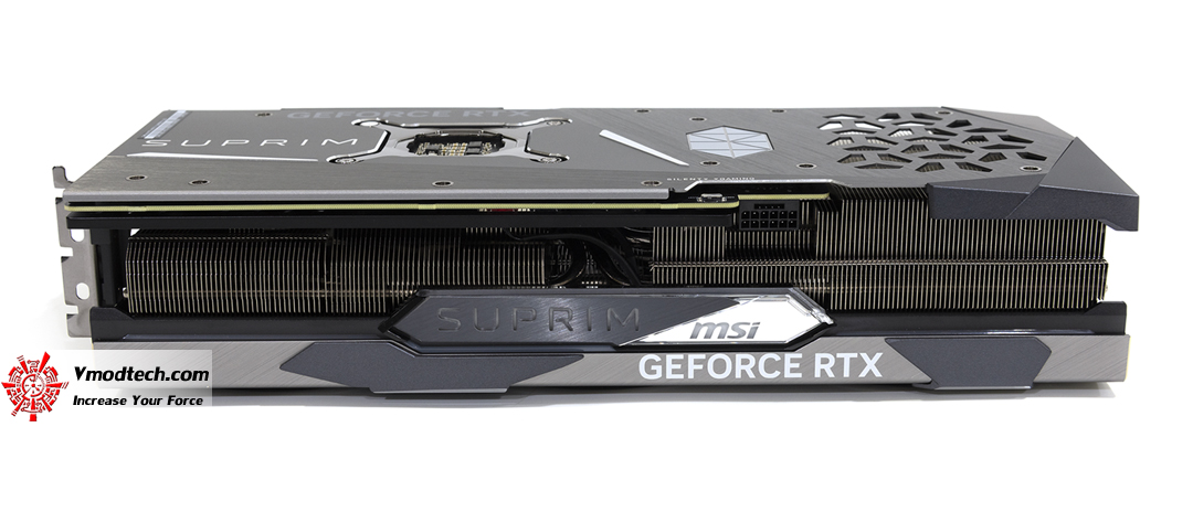 ความหนาของการ์ดตัวนี้จะอยู่ที่ 3.5 สล๊อดนะครับ การเชื่อมต่อนั้นผ่านทาง PCIe Gen 4 ในมุมนี้จะเห็นถึงฟินของฮีทซิ้งค์ขนาดใหญ่รวมถึงการดามโครง PCB ไว้อย่างแข็งแรงเลย