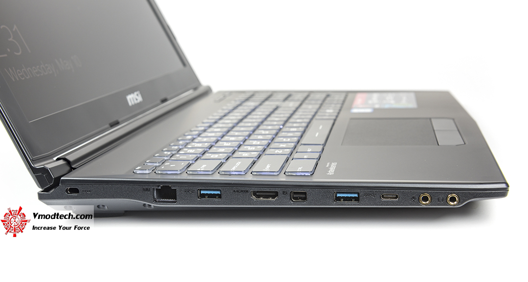 ด้านซ้ายของตัวโน๊ตบุ๊คนั้นจะมีพอร์ท LAN USB 2 ช่อง พอร์ท Display output ซึ่งจะมีพอร์ท HDMI และ Minidisplay Port USB type C และขวาช่องเสียบหูฟัง/ไมค์