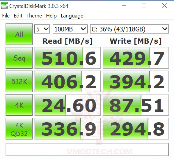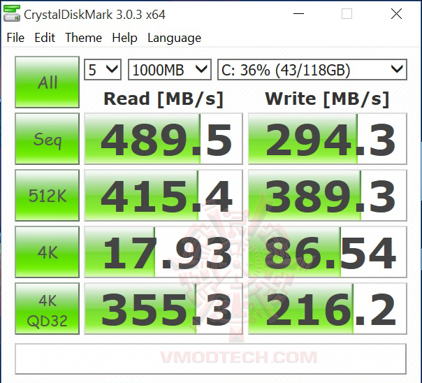 ในส่วนของ SSD นั้นแรงดีเลยทีเดียวครับ ขนาดใส่ข้อมูลต่างๆลงไปทั้ง OS และโปรแกรมต่างๆ ก็ยังแรงในระดับการอ่านเขียน 500/430MB/s กันเลยทีเดียว