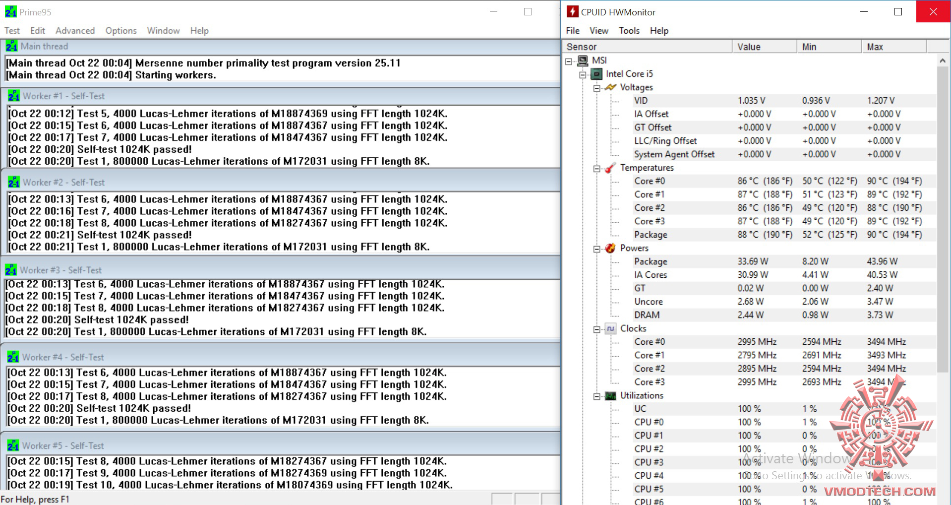 ในการ ทดสอบอุณหภูมิของซีพียูครับ โดยรัน Prime95 ทิ้งไว้ประมาณเกือบ 15นาที อุณหภูมิสูงสุดจะอยู่ที่ 90องศาครับ แต่จะป้วนเปี้ยนทำงานกันอยู่ที่ 86-88องศาฯครับ ก็ถือโอเคครับ