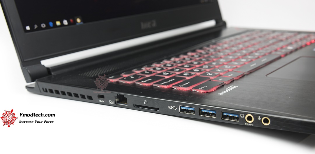 มุมมองด้านซ้ายครับ ซ้ายสุดจะเป็นช่องเสียบล๊อคเครื่อง ถัดไปก็เป็นการ์ดรีดเดอร์ ช่องเสียบสายแลน ช่องเสียบ SD Card ช่องเสียบ USB 3.1 สามช่อง และขวาสุดในรูปจะเป็นช่องเสียบหูฟังกับไมค์ 3.5 มม