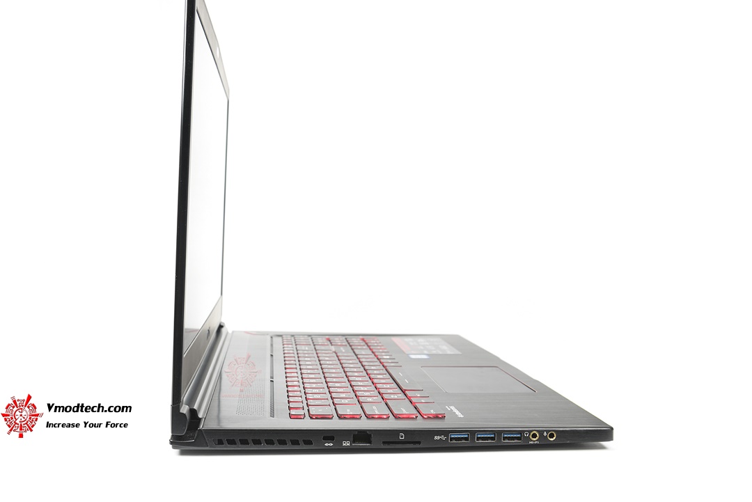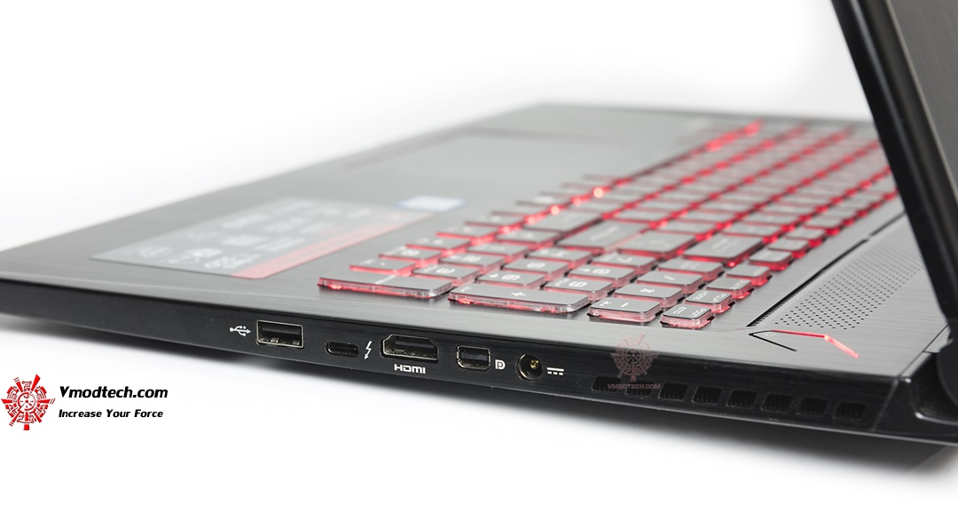 ด้านขวาจะมีช่อง USB 3.1 โดยจะเป็น type-c หนึ่ง ถัดมาจะเป็นช่องเสียบ HDMI และ Mini DisplayPort สำหรับต่อจอนอก และท้ายสุดจะเป็นช่องเสียบไฟเลี้ยง