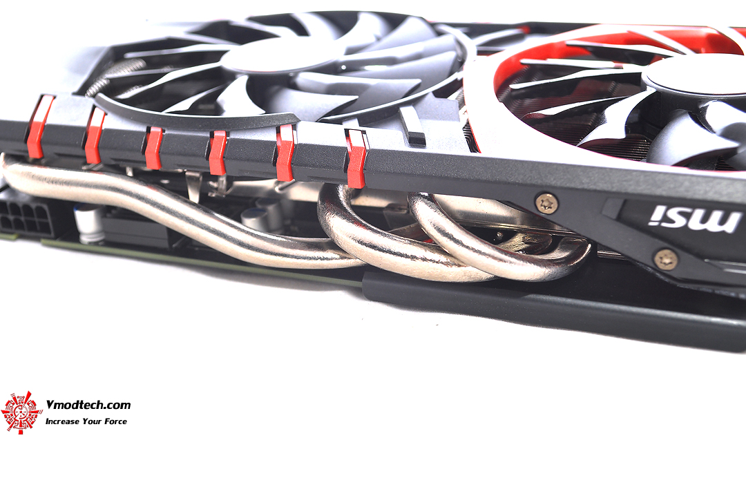 ฮีตไปป์มีด้วยกัน 3ท่อ ด้านละ3 รวมเป็นหกช่วยในการดึงความร้อนมายังฮีตซิงค์และที่สำคัญของระบบ Twin Frozr V คือการออกแบบหน้าสัมผัส GPU นั้นทาง MSI ได้ออกแบบให้หน้าสัมผัสทั้งหมดสัมผัสกับชิบเซ็ต GPU โดยตรงทั้งหมดทุกท่อฮีตไปป์นั่นเองครับ เดี๋ยวจะมีรายละเอียดในด้านล่างพร้อมทั้งรูปประกอบนะครับ