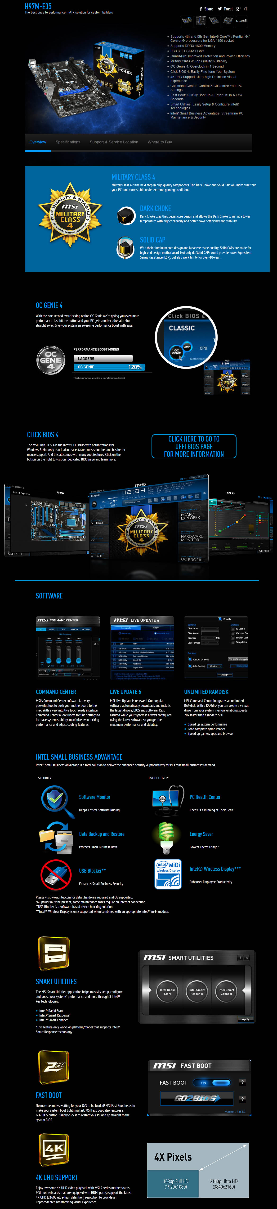 ……….สวัสดีครับ มาพบกับ Motherboard จาก MSI กันอย่างต่อเนื่องเลยนะครับ วันนี้มาพบกับ MSI H97M-E35 กันบ้าง เป็น Intel® H97 Express Chipset ซึ่ง MSI จัดไว้เป็น Classic Series ฟังจ์ชั่นการใช้งานต่างๆจัดมาให้กันแบบพอดีใช้ครับ และคุณสมบัติในด้านการโอเวอร์คล๊อคก็สามารถทำได้ดีครับ เกริ่นกันมาพอสมควรแล้วไปลุยกันดีกว่า ก่อนอื่นไปชมรายละเอียดจากเว็บไซค์ผู้ผลิตกันก่อนครับ