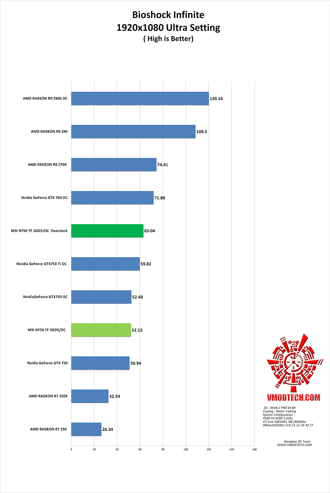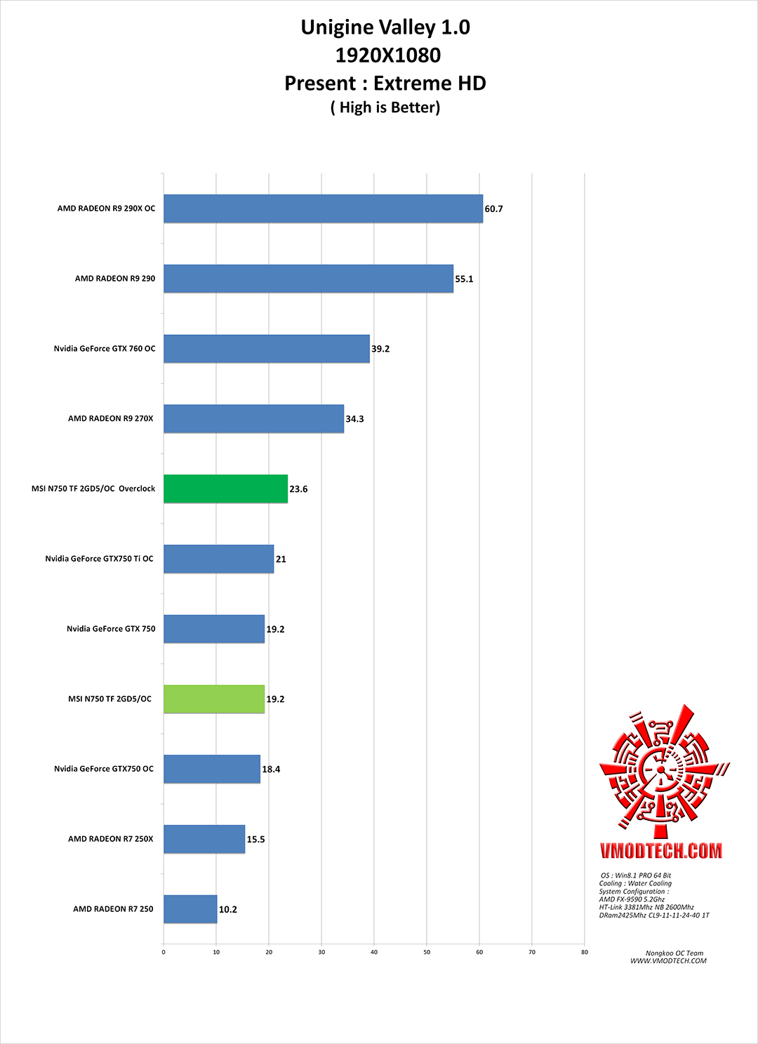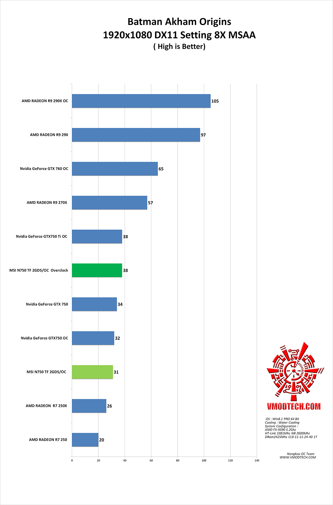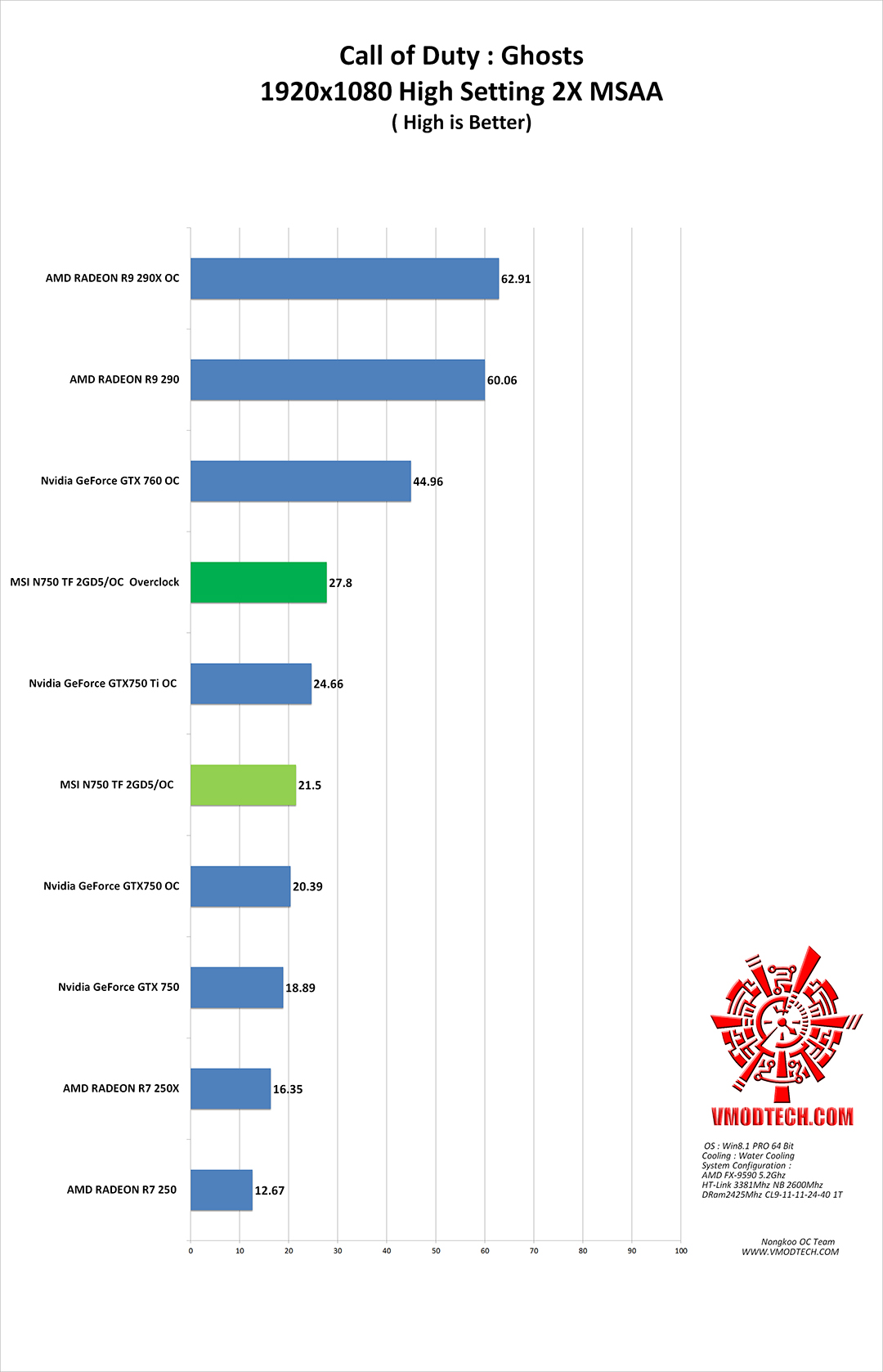 ก็มาถึงช่วงท้ายกันครับสำหรับการทดสอบ MSI N750 TF 2GD5/OC ที่วันนี้สร้างประสิทธิภาพไดีดีเยี่ยมมากๆเลยทีเดียวครับกับการ์ดจอระดับกลางๆของทาง MSI ในรุ่น MSI N750 TF 2GD5/OC สามารถสร้างผลงานได้ดีโดยใช้งานค่าโอเวอร์คล๊อกที่ความเร็ว Core 1284Mhz Memory1604Mhz Boost 1362Mhz ตลอดการทดสอบ สำหรับในเรื่องอุณหภูมิความร้อนนั้นถือว่าทำได้ยอดเยี่ยมมากครับกับการระบายความร้อนด้วยระบบ Advanced Twin Frozr IV ซึ่งอุณหภูมิอยู่ที่ 49องศาฯเท่านั้นด้านเสียงรบกวนนี่ต้องยกให้เลยครับว่าเงียบกริบกันจริงๆแม้จะเปิดรอบพัดลม 100% ก็ตามครับกับอัตรการบริโภคไฟที่ต่ำครับอีกทั้งยังไม่ต้องต่อไฟเลี้ยงเพิ่มให้กับตัวการ์ดจออีกด้วยเรียกได้ว่าประหยัดพื้นที่ของการจัดสายไฟแถมยังแรงแบบเต็มๆอีกด้วย ในด้านการใช้งานยังมีแอพพลิเคชั่นอย่าง GAMING APP ที่สามารถเลือกโหมดการทำงานได้ถึง 4โหมด OC Mode , Gaming Mode (Default) , Silent Mode , และ Cool Down ถือว่าเป็นลูกเล่นที่น่าสนใจอย่างมากเลยครับและด้วยวัสดุเกรดเยี่ยมมาตรฐาน MILITARY CLASS COMPONENT ที่เลือกวัสดุอุปกรณ์ในการทำงานเกรดเยี่ยมทำให้ท่านวางใจได้เลยครับว่าการ์ดจอ MSI N750 TF 2GD5/OC นั้นออกแบบมาสำหรับบรรดาเกมส์เมอร์ที่มีงบจำกัดต้องการความแรงแบบกลางๆแต่สามารถเพิ่มความแรงเองจากการโอเวอร์คล๊อกกันได้ตามใจชอบว่าท่านจะเลือกใช้ GAMING APP หรือ MSI Afterburner ในการใช้งาน ส่วนการใช้งานด้านกราฟฟิกนั้นถ้าไม่เล่นกันแบบเปิดสุดหมดผมมองว่า 1080P รายละเอียดระดับ High / Very High ไหวแน่นอนครับ เน้นปิด AA ส่วนถ้าเกมส์ไหนกินมากๆเน้นลดความละเอียดมาที่ High ข้อดีของ MSI N750 TF 2GD5/OC ในการใช้งานน้ันก็คือยัดเม็ดแรมมาให้ถึง 2048MB กันเลยครับซึ่งก็คงจะเหมาะกับบรรดาเกมส์เมอร์ในระดับหนึ่งครับในการใช้งานเล่นเกมส์ต่างๆ น่าจะเหมาะกับเกมส์เมอร์งบประมาณจำกัดและกำลังมองหาการ์ดจอที่ประหยัดพลังงาน เย็น เงียบ ไว้ใช้งาน MSI N750 TF 2GD5/OC เป็นตัวเลือกที่น่าสนใจดีเลยทีเดียวครับ โดยราคานั้นอยู่ราวๆ 6XXXบาทต้นๆ สำหรับในวันนี้กระผมก็ขอตัวลาไปก่อน พบกันใหม่เร็วๆนี้กับรีวิวอุปกรณ์ใหม่ๆจัดเต็มทุกการทดสอบที่ Vmodtech.com สวัสดีครับ