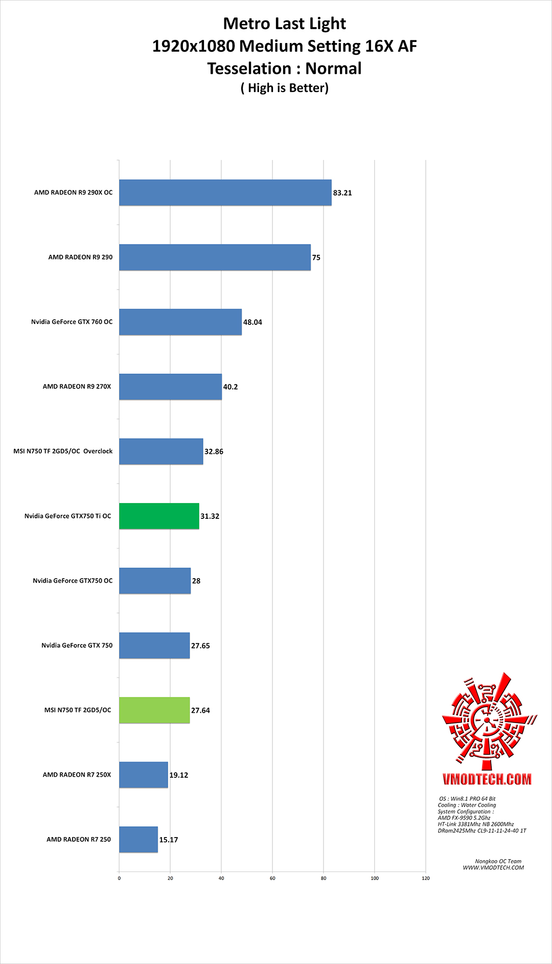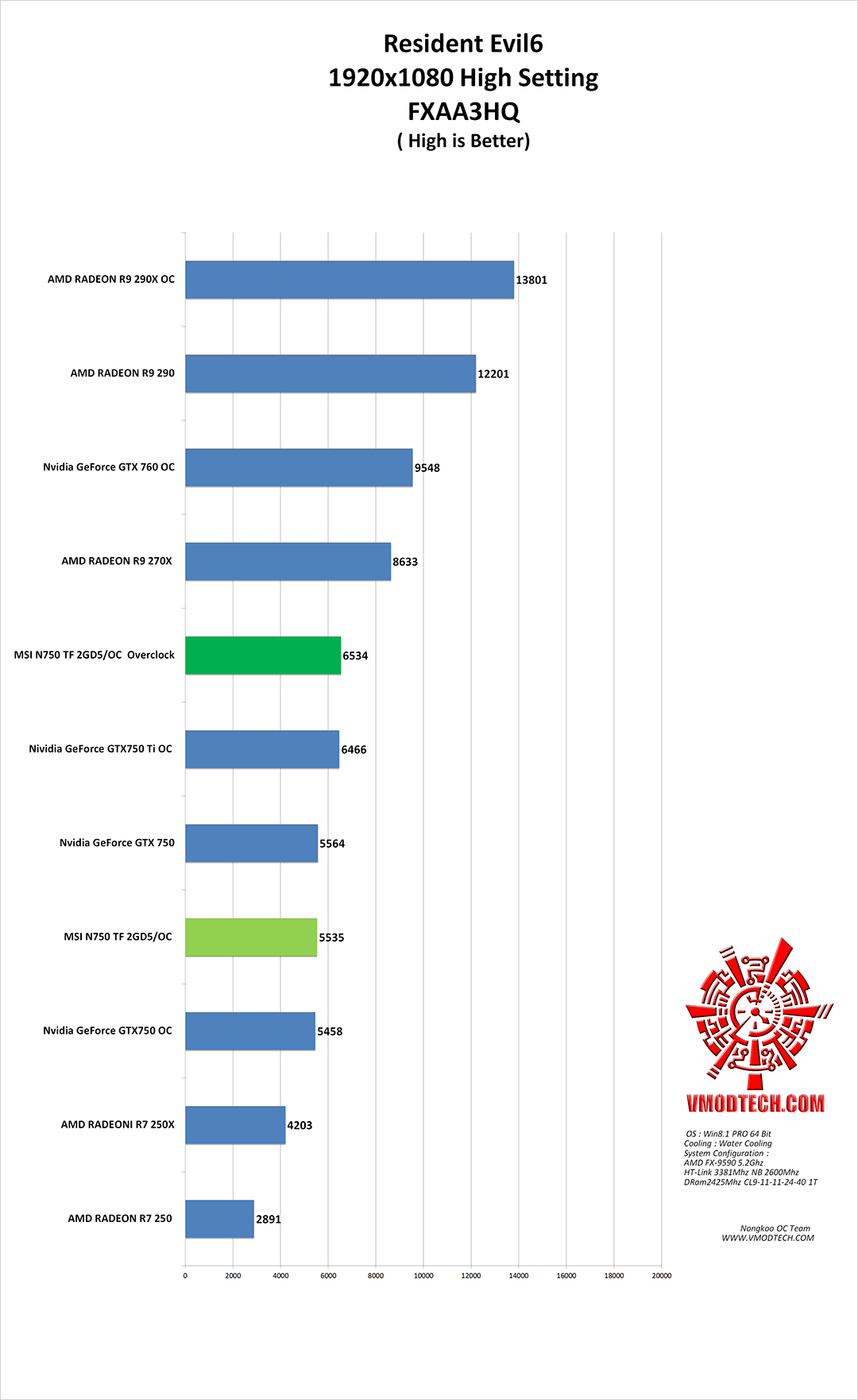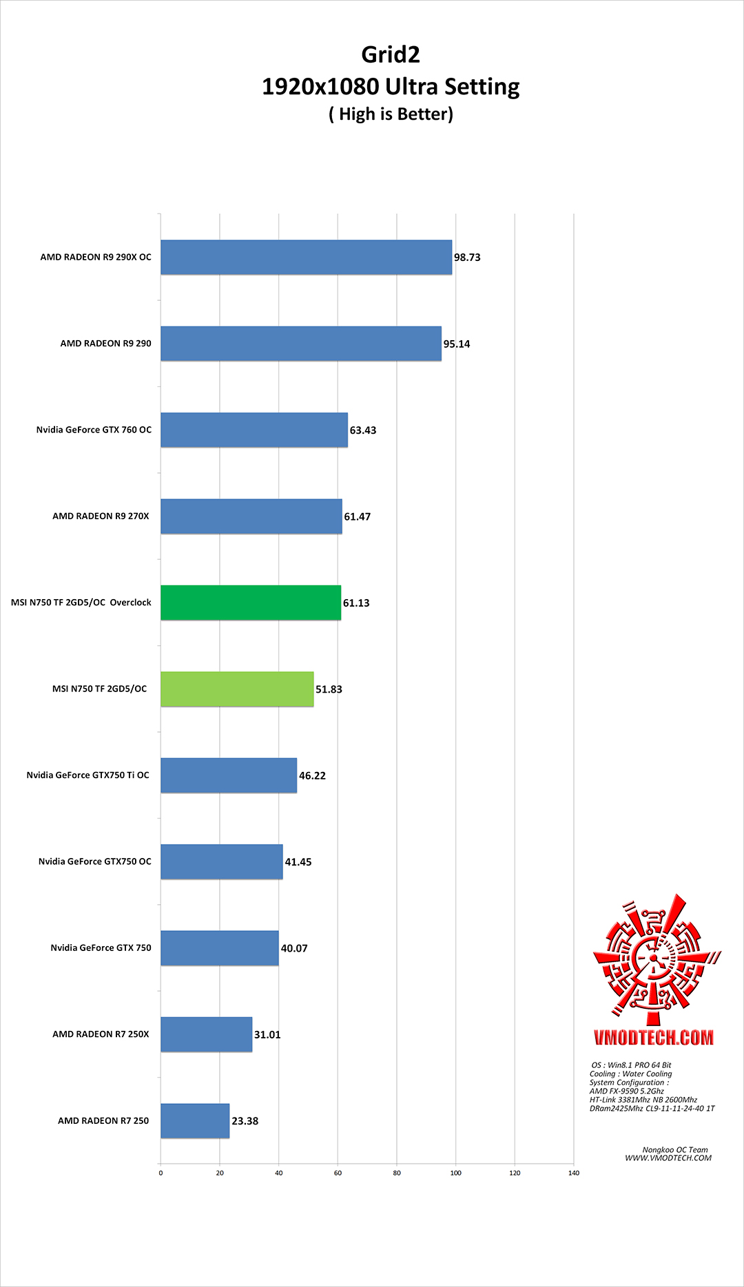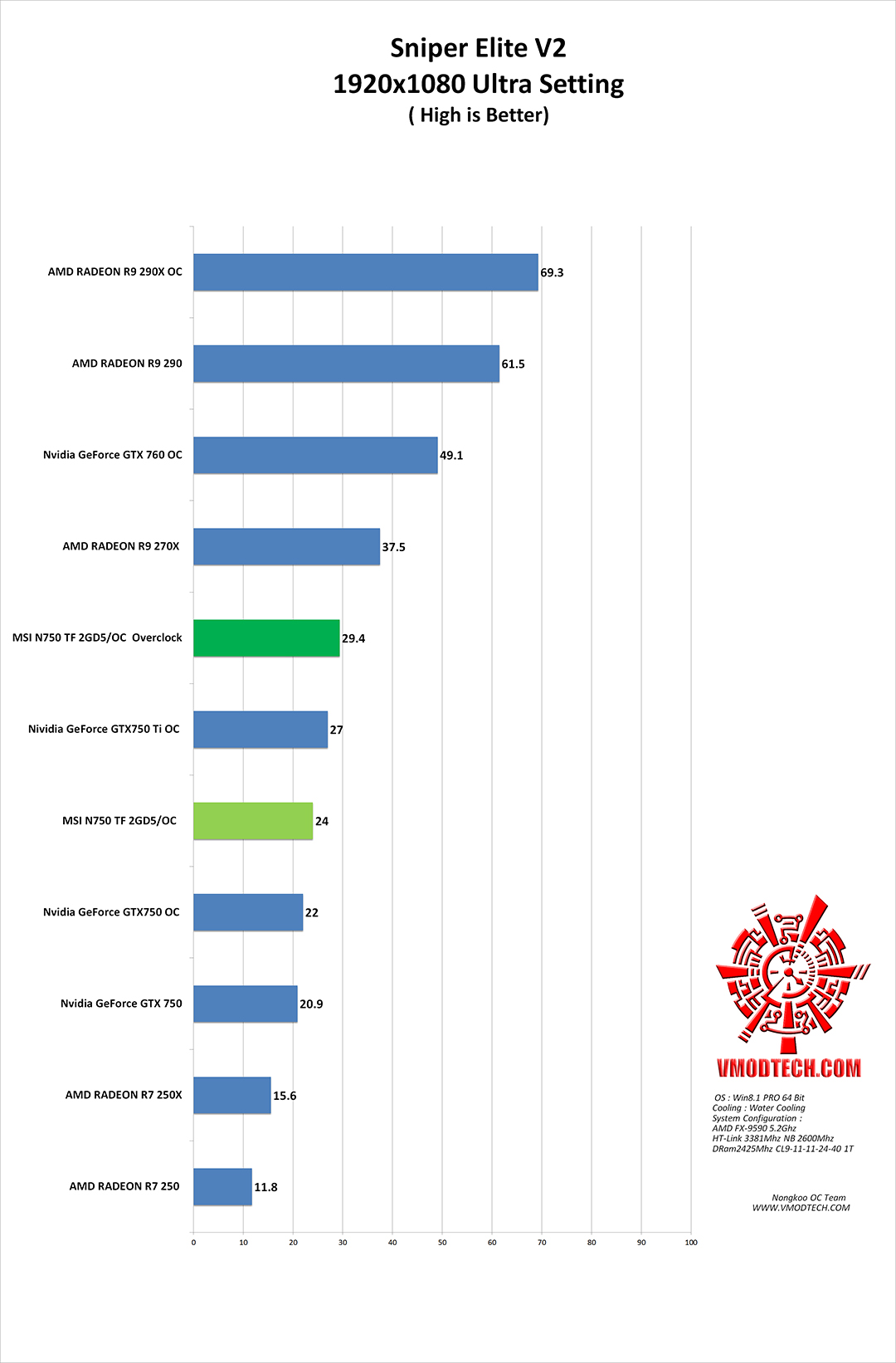 ก็มาถึงช่วงท้ายกันครับสำหรับการทดสอบ MSI N750 TF 2GD5/OC ที่วันนี้สร้างประสิทธิภาพไดีดีเยี่ยมมากๆเลยทีเดียวครับกับการ์ดจอระดับกลางๆของทาง MSI ในรุ่น MSI N750 TF 2GD5/OC สามารถสร้างผลงานได้ดีโดยใช้งานค่าโอเวอร์คล๊อกที่ความเร็ว Core 1284Mhz Memory1604Mhz Boost 1362Mhz ตลอดการทดสอบ สำหรับในเรื่องอุณหภูมิความร้อนนั้นถือว่าทำได้ยอดเยี่ยมมากครับกับการระบายความร้อนด้วยระบบ Advanced Twin Frozr IV ซึ่งอุณหภูมิอยู่ที่ 49องศาฯเท่านั้นด้านเสียงรบกวนนี่ต้องยกให้เลยครับว่าเงียบกริบกันจริงๆแม้จะเปิดรอบพัดลม 100% ก็ตามครับกับอัตรการบริโภคไฟที่ต่ำครับอีกทั้งยังไม่ต้องต่อไฟเลี้ยงเพิ่มให้กับตัวการ์ดจออีกด้วยเรียกได้ว่าประหยัดพื้นที่ของการจัดสายไฟแถมยังแรงแบบเต็มๆอีกด้วย ในด้านการใช้งานยังมีแอพพลิเคชั่นอย่าง GAMING APP ที่สามารถเลือกโหมดการทำงานได้ถึง 4โหมด OC Mode , Gaming Mode (Default) , Silent Mode , และ Cool Down ถือว่าเป็นลูกเล่นที่น่าสนใจอย่างมากเลยครับและด้วยวัสดุเกรดเยี่ยมมาตรฐาน MILITARY CLASS COMPONENT ที่เลือกวัสดุอุปกรณ์ในการทำงานเกรดเยี่ยมทำให้ท่านวางใจได้เลยครับว่าการ์ดจอ MSI N750 TF 2GD5/OC นั้นออกแบบมาสำหรับบรรดาเกมส์เมอร์ที่มีงบจำกัดต้องการความแรงแบบกลางๆแต่สามารถเพิ่มความแรงเองจากการโอเวอร์คล๊อกกันได้ตามใจชอบว่าท่านจะเลือกใช้ GAMING APP หรือ MSI Afterburner ในการใช้งาน ส่วนการใช้งานด้านกราฟฟิกนั้นถ้าไม่เล่นกันแบบเปิดสุดหมดผมมองว่า 1080P รายละเอียดระดับ High / Very High ไหวแน่นอนครับ เน้นปิด AA ส่วนถ้าเกมส์ไหนกินมากๆเน้นลดความละเอียดมาที่ High ข้อดีของ MSI N750 TF 2GD5/OC ในการใช้งานน้ันก็คือยัดเม็ดแรมมาให้ถึง 2048MB กันเลยครับซึ่งก็คงจะเหมาะกับบรรดาเกมส์เมอร์ในระดับหนึ่งครับในการใช้งานเล่นเกมส์ต่างๆ น่าจะเหมาะกับเกมส์เมอร์งบประมาณจำกัดและกำลังมองหาการ์ดจอที่ประหยัดพลังงาน เย็น เงียบ ไว้ใช้งาน MSI N750 TF 2GD5/OC เป็นตัวเลือกที่น่าสนใจดีเลยทีเดียวครับ โดยราคานั้นอยู่ราวๆ 6XXXบาทต้นๆ สำหรับในวันนี้กระผมก็ขอตัวลาไปก่อน พบกันใหม่เร็วๆนี้กับรีวิวอุปกรณ์ใหม่ๆจัดเต็มทุกการทดสอบที่ Vmodtech.com สวัสดีครับ