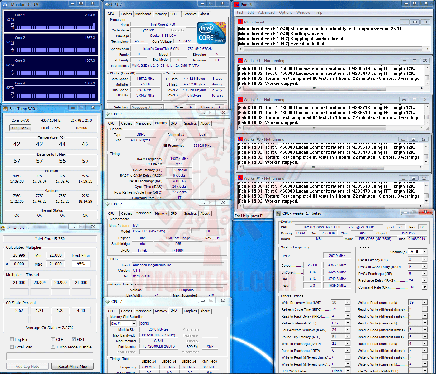…จัดกันไปครับโปรแกรมเทสต์เสถียรภาพชุดใหญ่ปิดท้ายก่อนจาก ที่ความเร็วของซีพียู Core i5 750 ในระดับที่สูงถึง 4.357GHz โดยเทสต์กันในห้องที่ค่อนข้างร้อนอุณหภูมิประมาณ 28-29องศาเซลเซียสกันเช่นเดิม ผมอยากบอกว่าตั้งแต่ที่ผมเล่นกับซีพียู Core i5 750 ตัวนี้มา นอกจาก MSI Big Bang-Trinergy แล้ว ผมยังไม่เคยเจอเลยครับว่าบอร์ดไหนสามารถทดสอบความเสถียรภาพแบบหนักหน่วงที่ความเร็วที่สูงระดับเลย 4.3GHz ขึ้นไปได้เลย ไม่รู้ว่า MSI เขามีดีตรงไหนเหมือนกัน อาจจะเป็นที่วิธีการเซตไบออสที่แสนง่ายมันจะมาถูกโฉลกกับผมที่ช่วงหลังๆไม่ค่อยจะมีเวลาให้ในการเซตไบออสนานๆเหมือนก่อนหรือเปล่าก็ไม่แน่ใจนะครับ แต่ที่แน่ๆก็คือ MSI ช่วงหลังๆนี่ ของเขามากันดีจริงๆครับในเรื่องของการโอเวอร์คล็อค ใครที่เคยเห็นแบรนด์นี้แล้วร้องยี้ลากไม่ไป อยากให้ลองหันกลับมาดูกันใหม่นะครับ เพราะว่าเดี๋ยวนี้ MSI เขาพัฒนากันแล้ววววววว