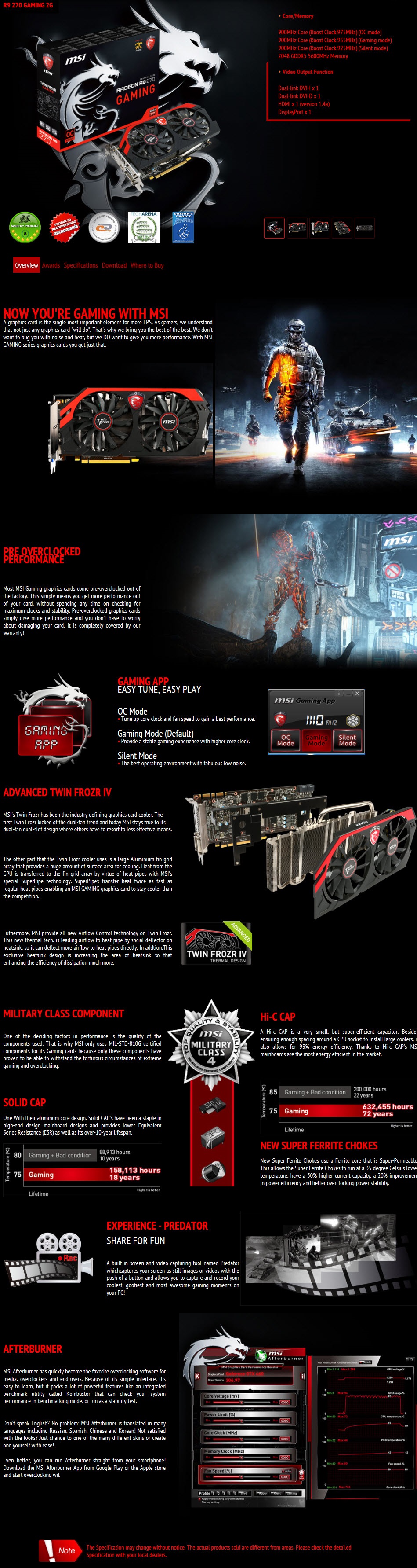 สวัสดีครับ วันนี้เป็นคิวของบทความทดสอบกราฟฟิกการ์ดรุ่นกลางเล็กจากค่าย ATI บ้างหลังจากตามติดการเปิดตัวของ APU รุ่นใหม่จาก AMD พร้อมๆกับเมนบอร์ดไปแล้ว วันนี้ผนำเอา MSI Radeon R9 270 OC Twin FROZR Gaming ซึ่งเป็นกราฟฟิกการ์ดที่ใช้ GPU R9 270 จาก Radeon มาทำการ Overclock และทำการปรับเปลี่ยนชุดระบายความร้อนเป็นของ MSI เองในซีรีย์ Gaming ก่อนที่จะไปชมประสิทธิภาพของการ์ดเรามาติดตามรายละเอียดของตัวการ์ดจากหน้าเว็บไซด์ของ MSI กันก่อนครับ