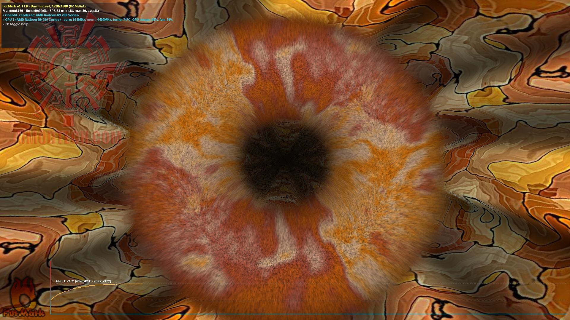 อุณหภูมิของการ์ดขณะ Furmark นั้นจะอยู่ที่ไม่เกิน 71 องศา รอบพัดลมออโต้ 34 เปอร์เซนต์ตามโพรไฟล์ของ Bios เสียงพัดลมชิลเลยครับทีนี้