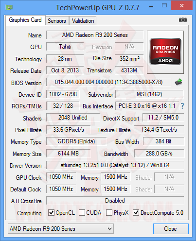 MSI RADEON R9 280X GAMING 6GB GDDR5 @ 1050/1500 MHz (Default)
