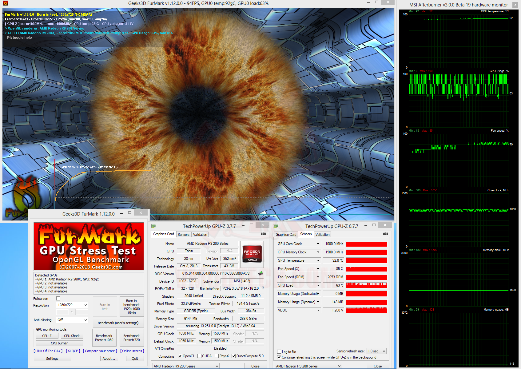 พอมีโหลดด้วย Furmark อุณหภูมิก็ขึ้นไป 92 องศา พัดลม Auto 85%