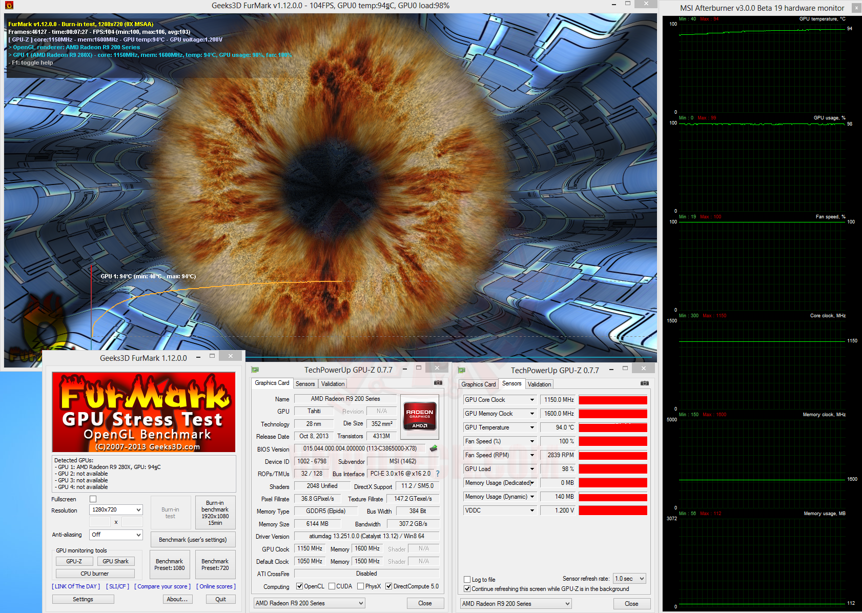 พอมีโหลดด้วย Furmark อุณหภูมิก็ขึ้นไป 94 องศา พัดลม 100%
