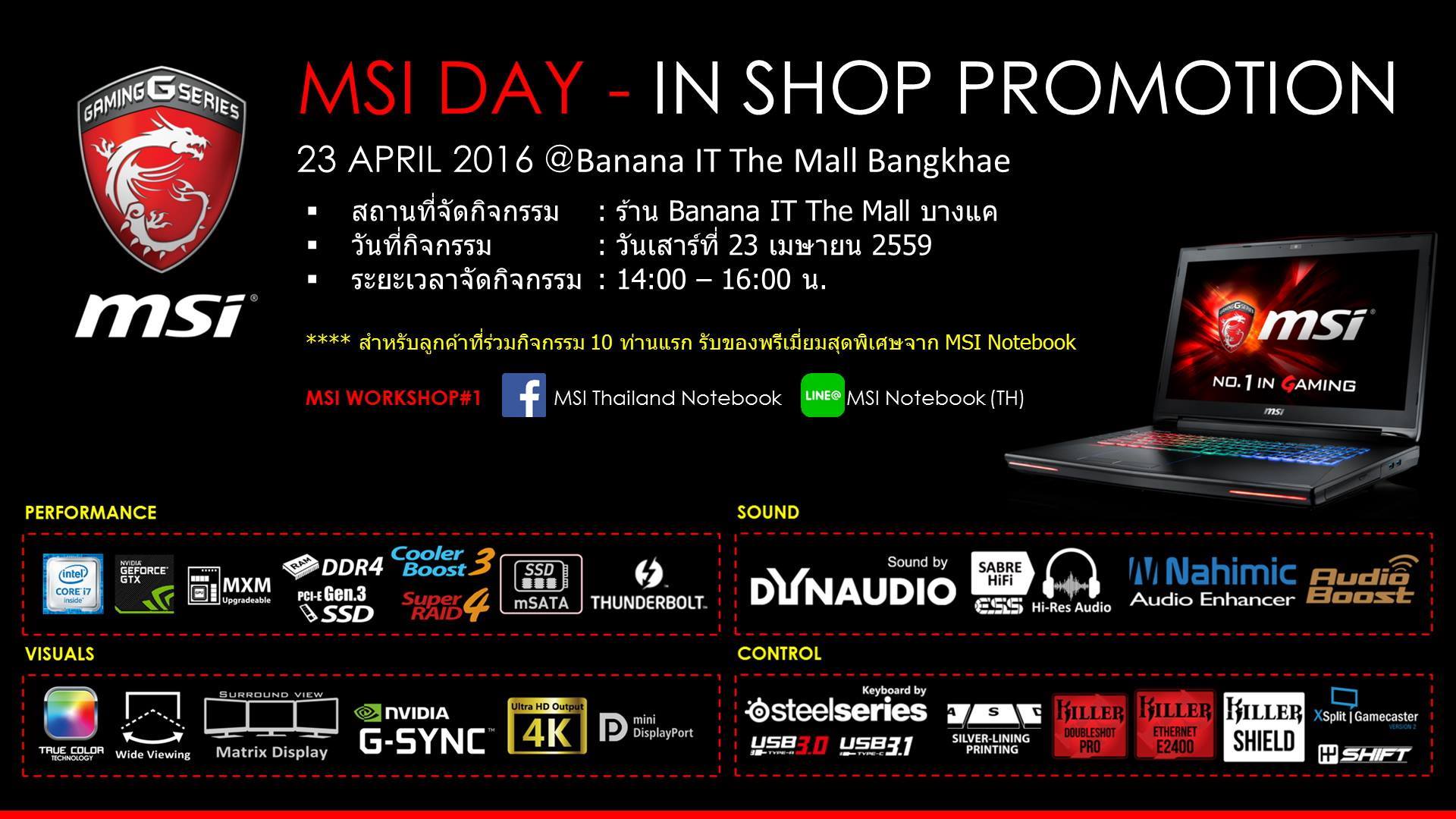 โดยงานนี้จะเป็นงาน MSI IN-SHOP PROMOTION ครั้งแรกในประเทศไทยไทย ที่จะมาเดินสายให้คำแนะนำ สอนลูกเล่น หรือทริกเล็กๆที่เรามองข้าม รวมถึงลูกค้าที่สนใจ Gaming Notebook เพื่อให้ลูกค้าได้สัมผัส ทดลอง และเห็นลูกเล่นมากมายใน MSI Gaming Notebook และพลาดไม่ได้ กับโปรโมชั่นพิเศษเฉพาะลูกค้าที่มาเข้าร่วม หรือหาซื้อเครื่องใหม่ โดยสามารถสอบถามรายละเอียดเพิ่มเติมได้ทางกล่องข้อความของเพจ MSI Thailand Notebook หรือโทร 02 694 1787 (จันทร์-ศุกร์ 9.00 น. - 18.00 น.)
