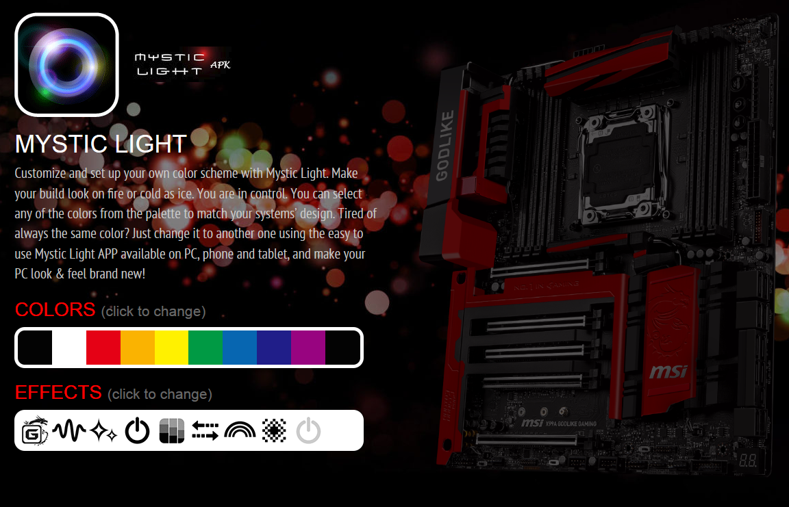 …แถบไฟ LED อันสวยงามของบอร์ดรุ่นนี้ สามาถปรับแต่งได้หลากหลายรูปแบบมากๆด้วย Application Mystic Light บน Smart Phone และ Tablet ที่ใช้ระบบปฏิบัติการ Android เชื่อมต่อกับระบบแบบไร้สายผ่าน Bluetooth 4.1 หรือจะใช้โปรแกรม Mystic Light ปรับใน PC โดยตรงเลยก็ได้นะครับ