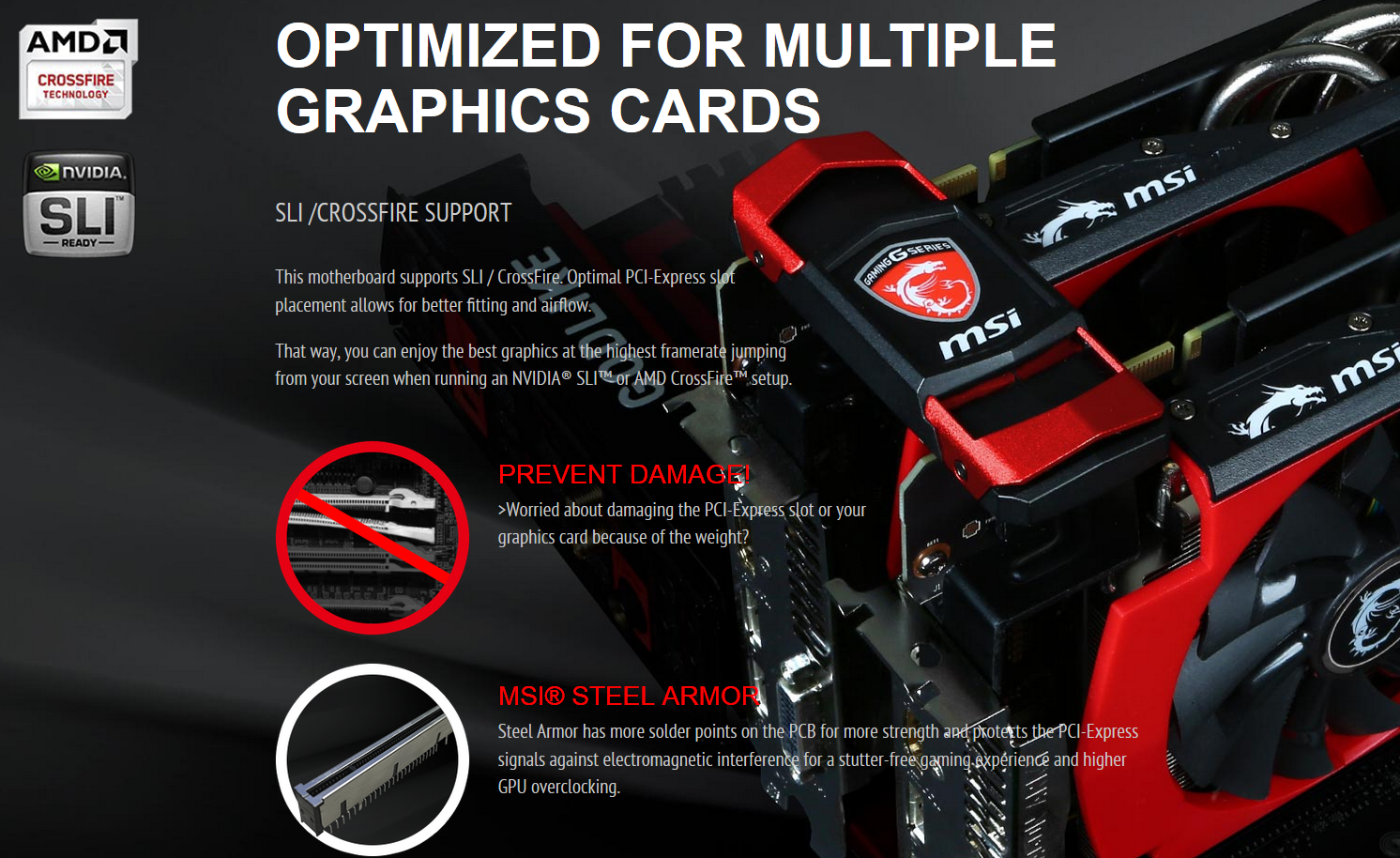 สล็อต PCI-E ทุกช่องของบอร์ดรุ่นนี้จะมาพร้อมกับ MSI® Steel Armor ที่มาเพื่อป้องกันความเสียหายของตัวสล็อตจากการเสียบกราฟฟิคการ์ดพร้อมกันหลายๆตัวครับ