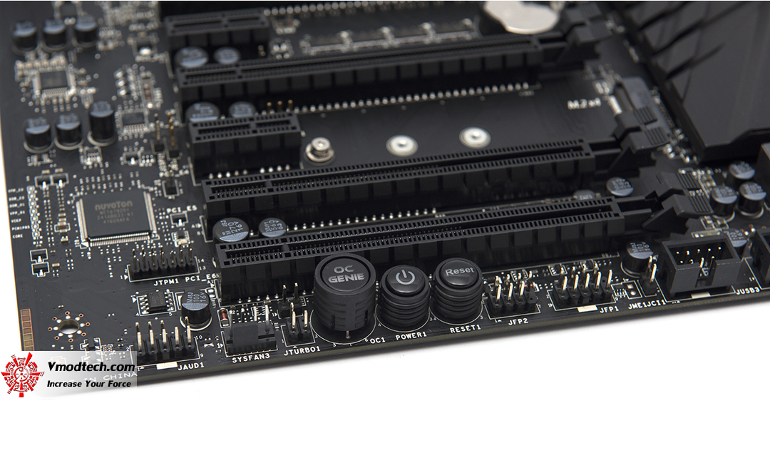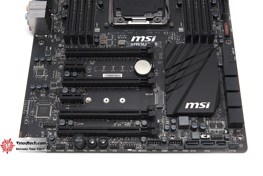 บริเวณล่างซ้ายสุดของบอร์ดนั้นน่าจะเป็นจุดที่สนใจเป็นพิเศษเนื่องจาก MSI X99S SLI PLUS นั้นได้ทำการติดตั้งสวิทซ์ ON/OFF และ Reset มาให้รวมถึง OC GENIE ซึ่งเป็นสวิทซ์ที่กดเพียงครั้งเดียวก็จะสั่งให้ระบบทำการโอเวอร์คล๊อกให้เราได้ทันทีไม่ต้องออกแรง