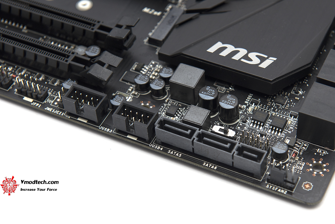 ขวาล่างของบอร์ดนั้นจะเป็นบริเวณที่ติดตั้งพอร์ท SATA III และ SATA Express ส่วนจุดเชื่อมต่อไปยัง Front Panel ก็ยังมีเหมือนเดิม