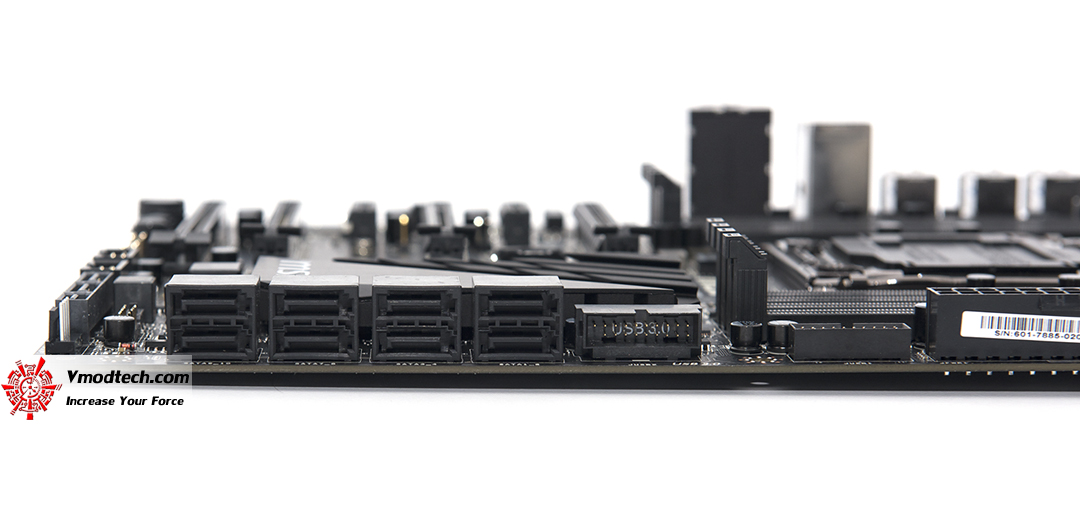 นี่เป็นบริเวณที่ติดตั้งสล๊อด SATA มีมาให้ใช้งานกันเหลือเฟือเลยสำหรับ SATA 6GB จำนวนแปดช่อง ด้านขวานั้นจะเป็นพอร์ทเชื่อมต่อไปยัง USB 3.0 ที่ front panel ครับ