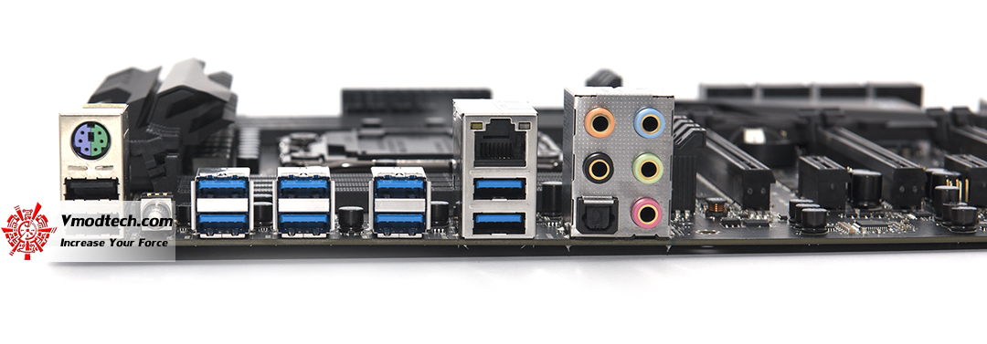 Back Panel ครับ ช่อง USB 3.0 8 ช่อง และ USB 2.0 2 ช่องรวมกันระหว่าง X99 และ gigabit lan 1 ช่อง ปุ่มเคลียร์ Bios จะอยู่ด้านซ้ายมือครับ ส่วนด้านขวามือจะเป็นส่วนของ ภาคเสียงทั้งหมด