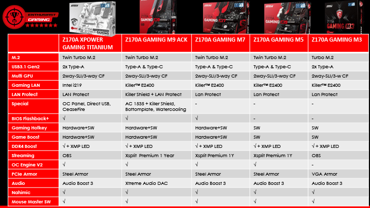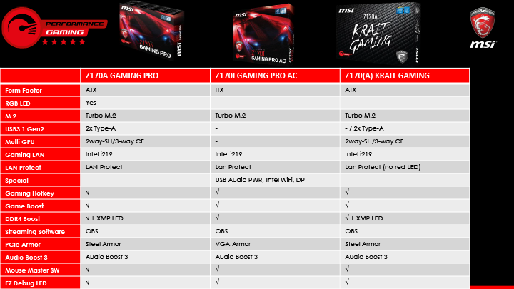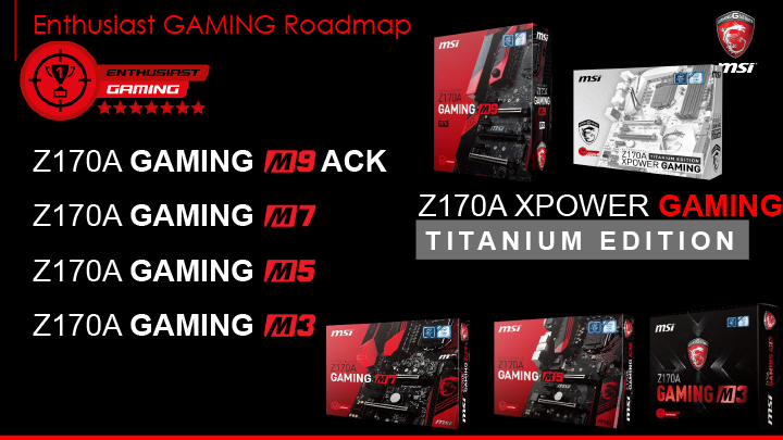 - มีให้เลือกหลากหลายรุ่นครับ ทั้งตัวท็อปอย่าง Z170A XPOWER GAMING TITANIUM, Z170A KRAIT GAMING, Z170I GAMING PRO