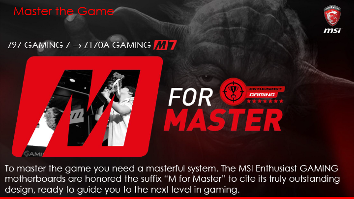 - MSI Z170 GAMING Motherboards ต่อยอดมาจาก MSI Z97 GAMING Motherboards ตัวอย่างเช่น Z97 GAMING 7 → Z170A GAMING M7 โดย M นั้นย่อมาจาก Master ครับ