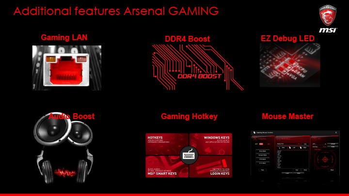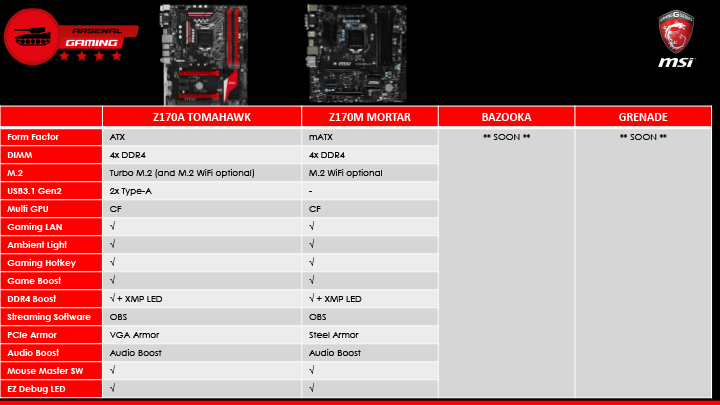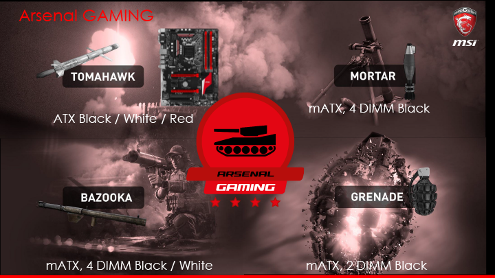 - MSI ยังเปิด ซีรี่ย์ใหม่ อย่าง Arsenal GAMING ซีรี่ย์ปืนใหญ่ที่มีทั้งหมด 4 รุ่นอย่าง Z170A TOMAHAWK, Z170M MORTAR, BAZOOKA และ GRENADE