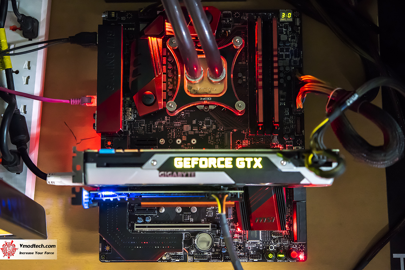 …ทดสอบกันง่ายๆที่ห้องอุณหภูมิประมาณ 25 องศา บนระบบระบายความร้อนด้วยน้ำธรรมดา จะมีไฟสีแดงสว่างสวยงามบริเวณซิงค์ระบายความร้อนของภาคจ่ายไฟด้วยนะครับ