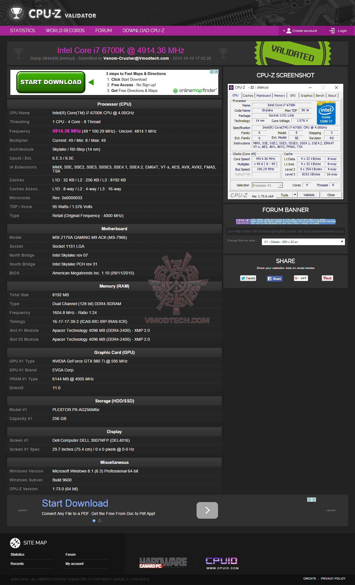 6th Generation Intel® Core™ i7-6700K @ 4,914.36MHz Bclk 100.29MHz