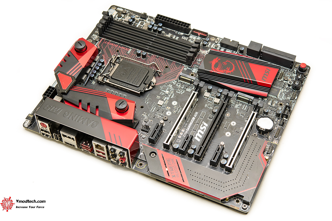 หน้าตาของมาเธอร์บอร์ดรุ่นนี้ จะออกแนวเข้มขรึมดำตัดแดงดุดัน ตามคอนเซปต์ของบอร์ดในตระกูล MSI GAMING Series ครับ