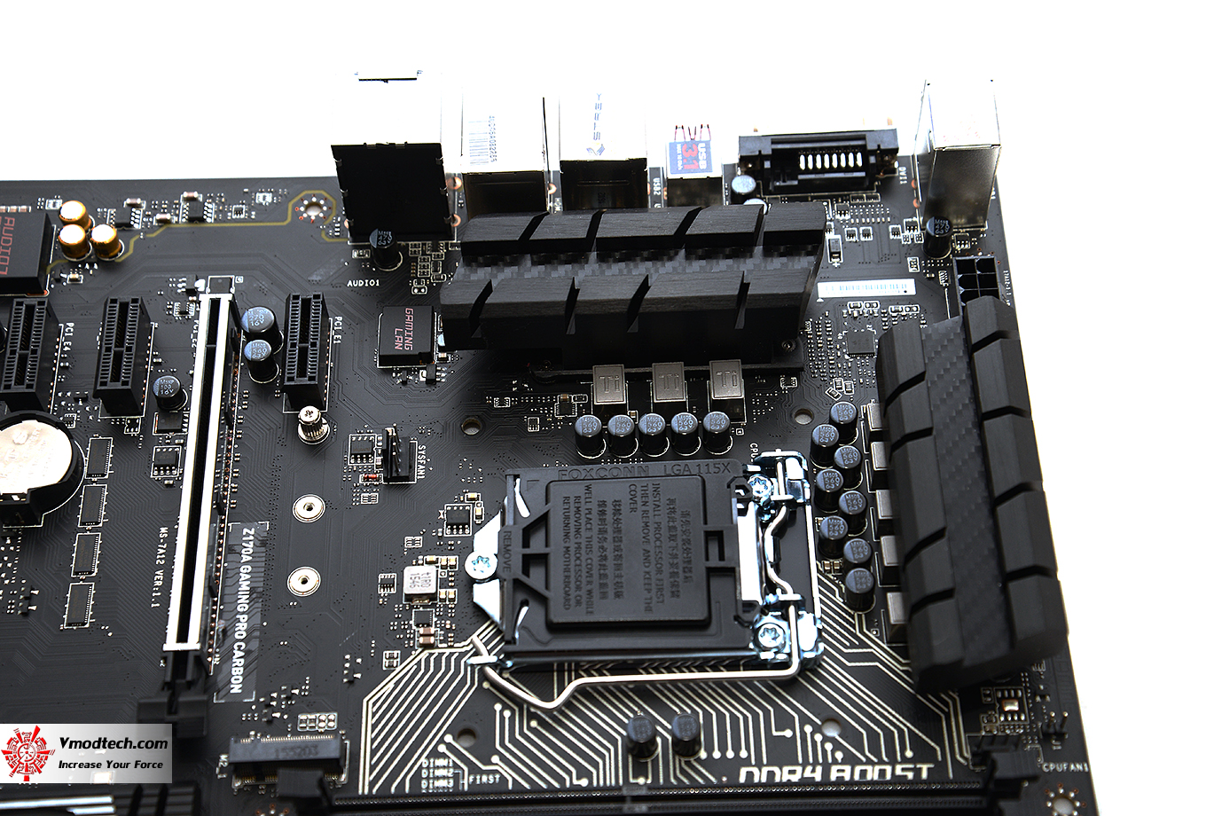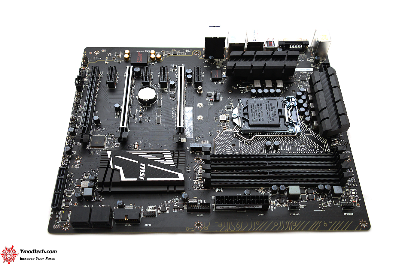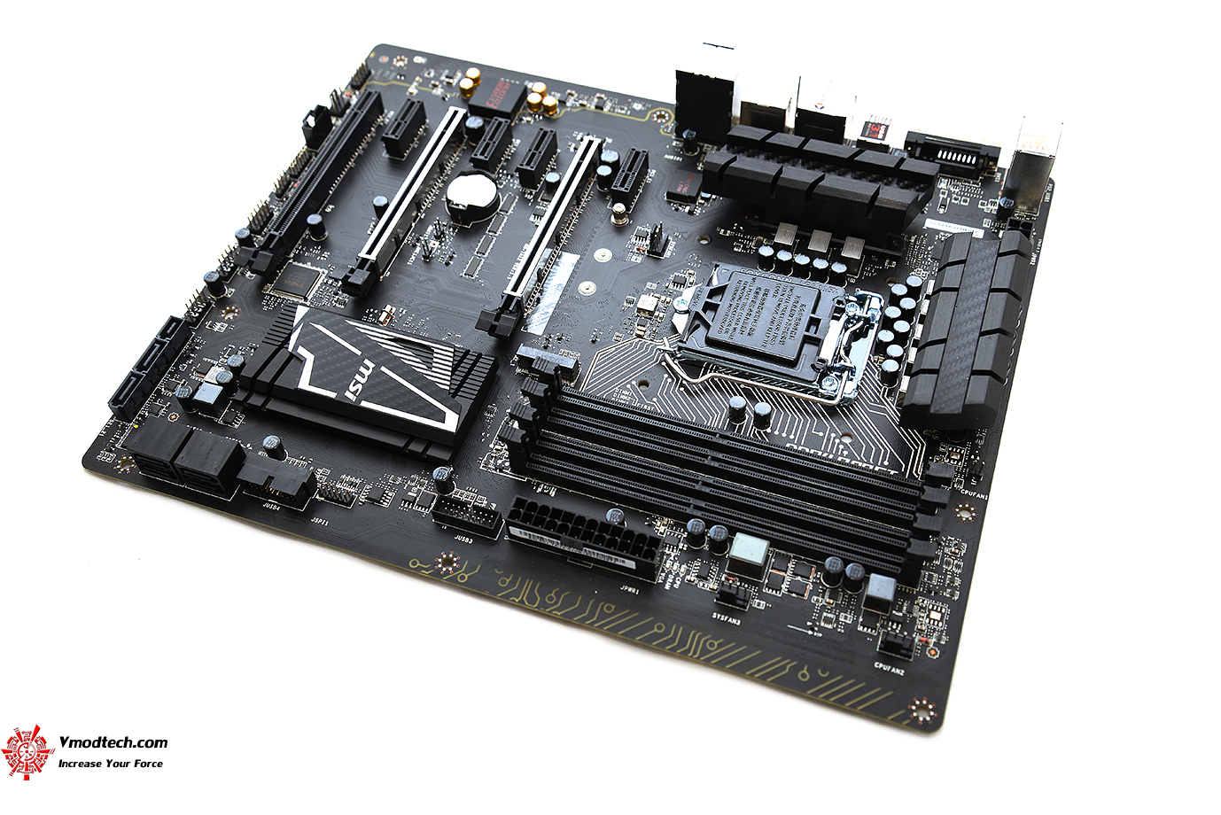 เมนบอร์ดสีดำสนิทครับแนวโทนสีเน้นเป็นแบบ carbon-fiber ครับ ส่วนฮีตซิงค์ชิบเซ็ตและเฟสไฟก็เป็นสีดำสนิทมีโลโก้สีขาวคาดครับ
