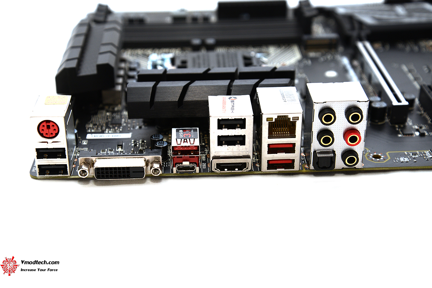มาดูพาแนล ด้านหลังกันบ้างครับ ประกอบด้วย 1 x PS/2 keyboard/ mouse port , 4 x USB 2.0 ports , 1 x DVI-D port , 2 x USB 3.1 Gen1 ports , 1 x USB 3.1 Gen2 port , 1 x USB 3.1 Gen2 Type-C port , 1 x HDMI™ port , 1 x LAN (RJ45) port , 1 x Optical S/PDIF OUT connector , 5 x OFC audio jacks