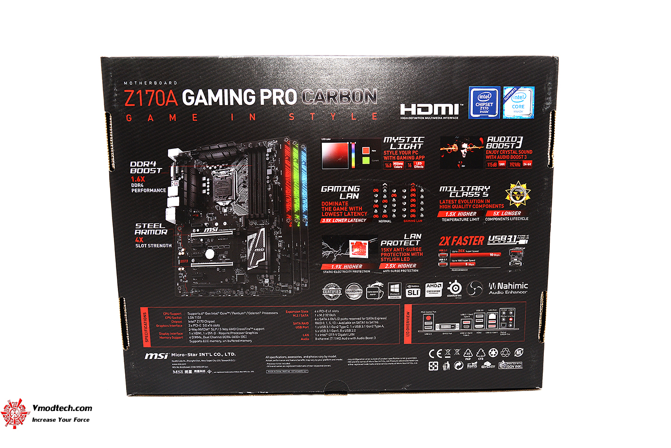 สวัสดีทุกท่านที่เยี่ยมชมเว็บไซต์ Vmodtech.com ในวันนี้เรามาชมรีวิวเมนบอร์ดเกมส์มิ่งทางฝั่ง Intel กันครับ ในแบรนด์ดังที่เรารู้จักกันดีอย่าง MSI ครับ โดยในวันนี้มากันในชื่อรุ่นเต็มๆว่า MSI Z170A GAMING PRO CARBON ซึ่งก็เป็นเมนบอร์ดใน GAMING SEIRES ของทาง MSI ครับ มากันในแนวโทนสีของคาร์บอนเคฟล่า (Carbon-Fiber) ที่อยู่ในรถแข่งที่ใช้คาร์บอนไฟเบอร์นั่นเองครับ สำหรับฟีเจอร์การทำงานนั้นแน่นอนครับว่าจัดเต็มสำหรับคอเกมส์เมอร์แน่นอนครับไม่ว่าจะเป็น GAMING LAN , Turbo M.2 32Gb/s , USB 3.1 Gen2 , Mystic Light , Audio Boost 3 , Game Boost ฯลฯ เรียกได้ว่าจัดเต็มตามสไตล์เมนบอร์ดเกมส์มิ่งของทาง MSI กันเลยทีเดียวครับ ส่วนสีสรรอีกอันที่ต้องพูดถึงก็คือแสงไฟ LED ที่มาในโหมด RGB อยู่ด้านหน้าตัวเมนบอร์ดซึ่งสามารถปรับการทำงานได้ตามต้องการครับ สำหรับวัสดุอุปกรณ์ต่างๆก็อยู่ในเกรดมาตรฐาน Military Class 5 ที่การันตีด้วยวัสดุเกรดเยี่ยมทั้งนั้นครับสำหรับเมนบอร์ดตัวนี้ ส่วนประสิทธิภาพการทำงานจะเป็นเช่นไรนั้น เดี๋ยวเราไปชมในรีวิวกันได้เลยครับ