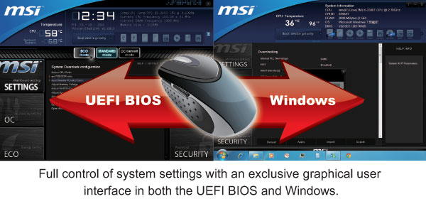 ClickBIOS II จาก MSI เป็นยูทิลิตี้ BIOS ตัวแรกที่รองรับทั้ง UEFI และ วินโดว์ สำหรับผู้ใช้งานที่ต้องการปรับแต่งค่า BIOS ของระบบด้วยเมาส์ เมื่อเทียบกับระบบการปรับแต่ง BIOS แบบเก่า ClickBIOS II สามารถทำงานได้ง่ายกว่าสำหรับผู้ใช้งานทั่วไปด้วยระบบอินเทอร์เฟซแบบกราฟิก ช่วยทำให้การปรับแต่งทำได้สะดวกและง่ายขึ้น และสิ่งที่สำคัญก็คือ ClickBIOS II ยังมีคุณสมบัติที่สามารถทำงานออนไลน์ในการอัพเดตไดร์เวอร์ อัพเดตไบออส และสำรองระบบ ได้ด้วย ซึ่งถือได้ว่าเป็นการช่วยให้การทำงานที่ดีสำหรับผู้ใช้งานขั้นสูง