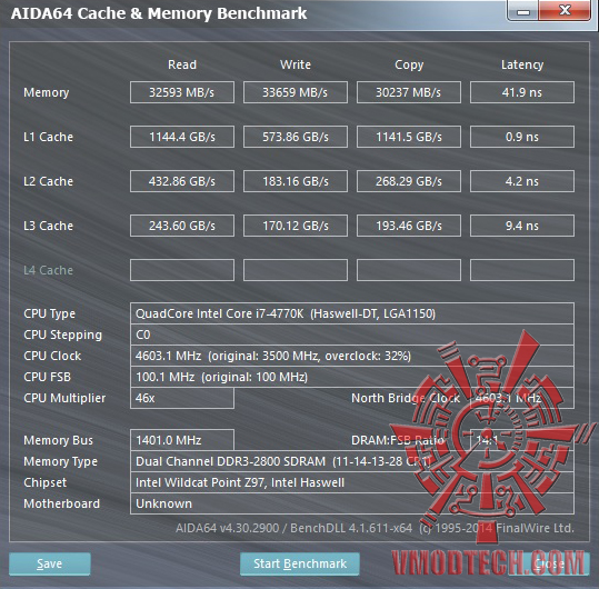 ค่า Memory Read อยู่ที่ 32593MB/s เลยทีเดียวครับส่วนค่า Write อยู่ที่ 33659MB/s เร็วตามบัสแรมที่วิ่ง 2800Mhz ครับ โดยกด Timing เพิ่มความแรงกันนิดหน่อย
