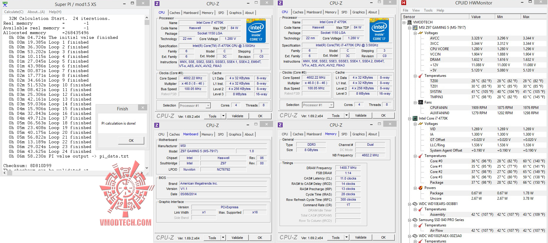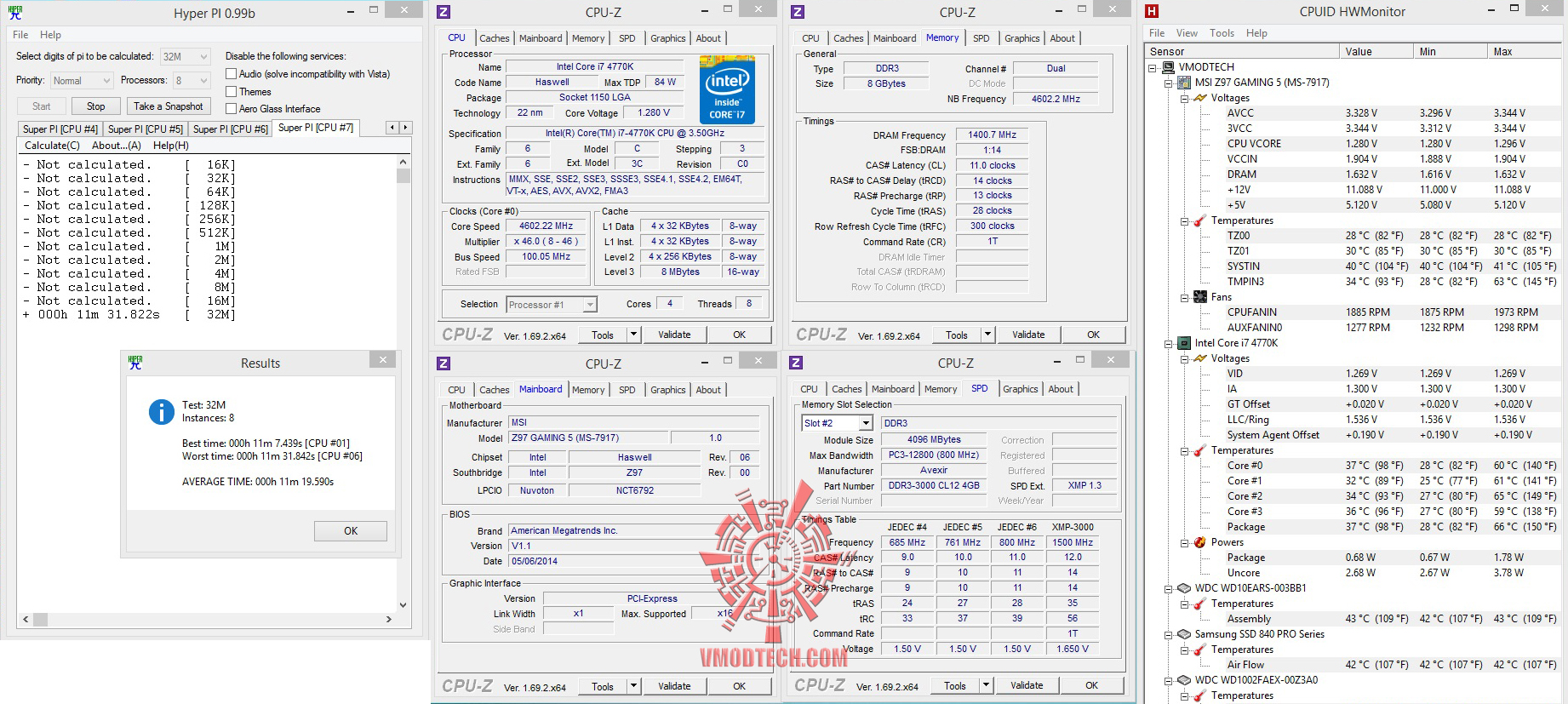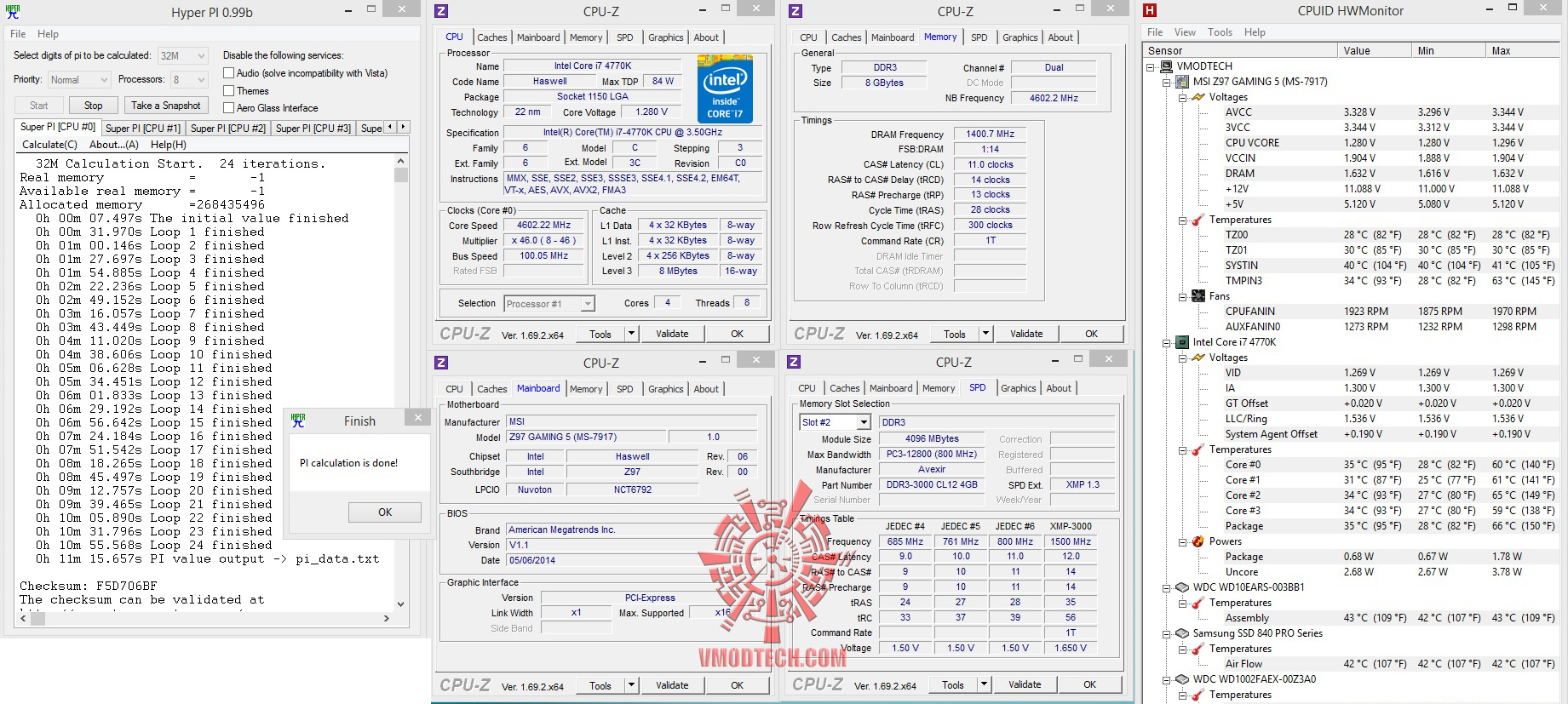 สำหรับชุด ทดสอบ SuperPI1MBจบไปที่ 7.831วินาที , 32MB จบไป6นาที58 .23วินาที แรงในระดับมาตราฐาน 4.6Ghzครับ โดยถ้ากด Sub Timing แน่นเท่าไหร่เวลาก็ยิ่งดีครับขึ้นอยู่กับประสิทธิภาพแรมเราด้วยว่าจะวิ่งดี ขนาดไหน , ส่วน HyperPI32MB ก็ผ่านหมดแรงแบบนิ่งๆใช้งานกันได้จริงอย่างมีเสถียรภาพครับ