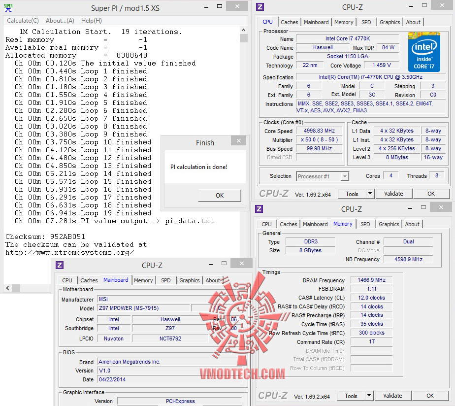 เทส SuperPI 1MB ได้ครับจบที่เวลา 7.281วินาที 7วิต้นๆไม่เลวครับ ถ้ากด Timing แน่นๆน่าจะเร็วขึ้นกว่านี้แน่นอนแต่ผมใช้คอนฟิกแรมเดิมนะครับเล่นแต่ความเร็วซีพียูเพิ่มเป็น 5Ghz เมนบอร์ด MSI Z97 MPOWER ก็สามารถพามาแตะได้แบบไม่ยากเย็นครับ นิ่งดีเลยทีเดียวครับรับรองว่าถ้าซีพียูท่านวิ่งดีไม่ตันแล้วล่ะก็เมนบอร์ด MSI Z97 MPOWER พร้อมที่จะพามาได้อย่างแน่นอน