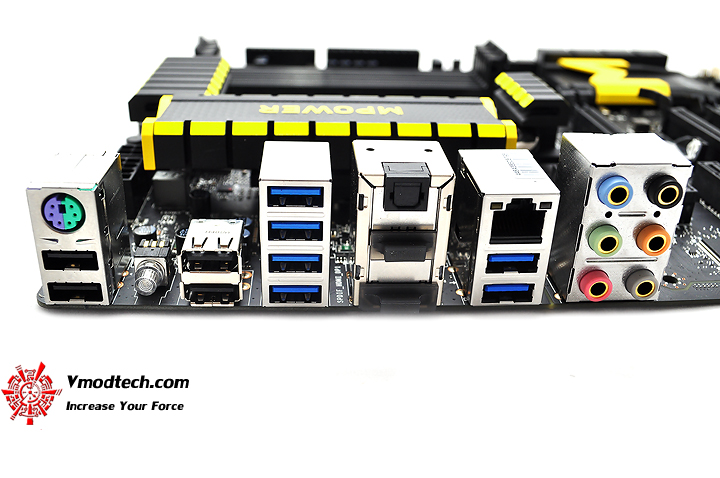 ช่องเชื่อมต่อ อุปกรณ์ด้านหลังประกอบด้วย 1 x PS/2 keyboard/mouse combo port , 1 x Clear CMOS button , 1 x Optical S/PDIF-out port , 4 x USB 2.0 ports , 6 x USB 3.0 ports , 1 x RJ45 LAN jack , 1 x 6 in 1 OFC audio jack , 1 x HDMI port , 1 x DisplayPort