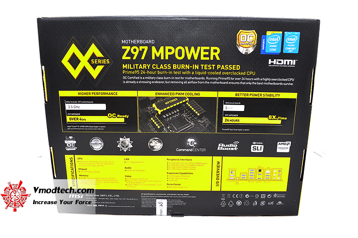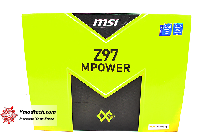 มากันในกล่องสีเหลืองมีโลโก้ MSI Z97 MPOWER พร้อมบอกฟีเจอร์และชื่อรุ่น MSI Z97 MPOWER หน้าตาคล้ายๆกันหมดครับในซีรี่ย์ POWER