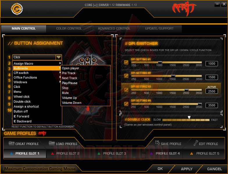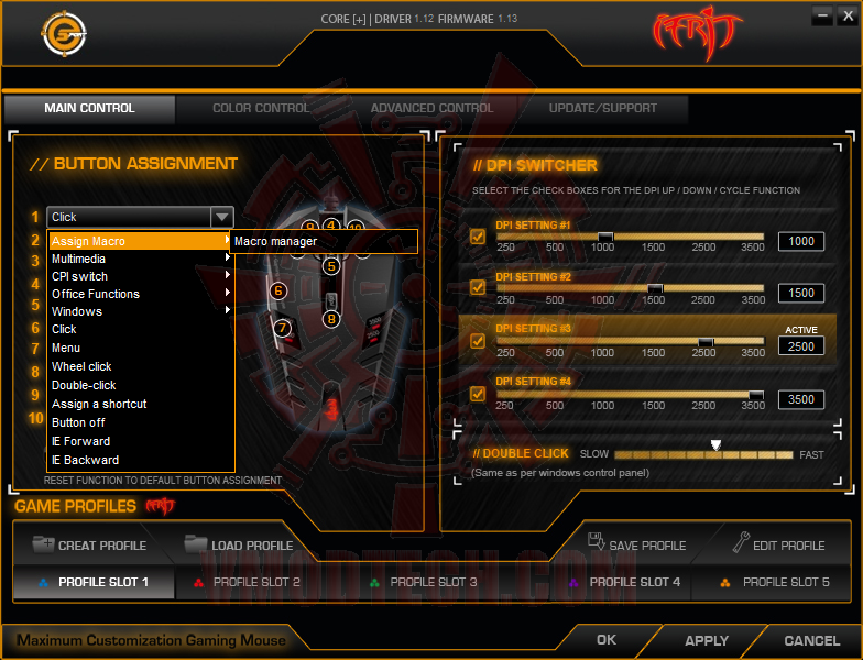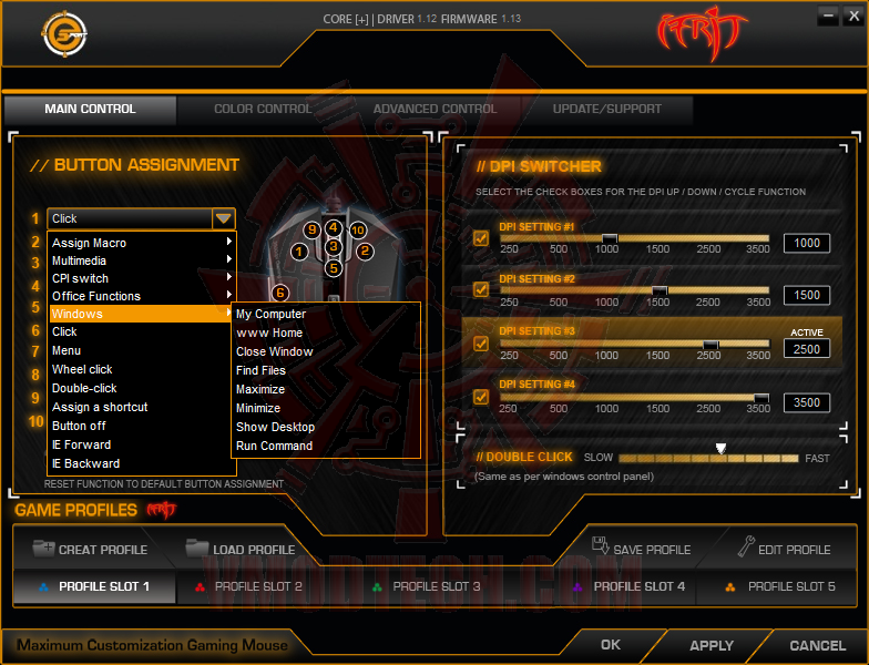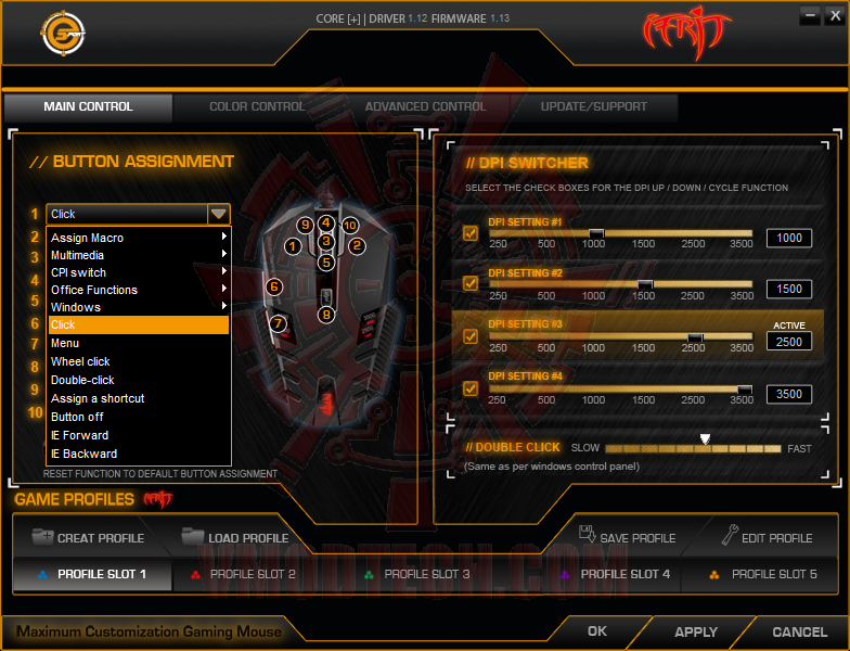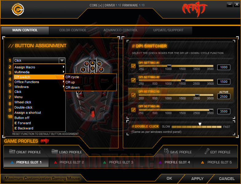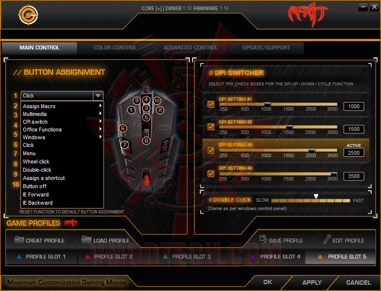 - DPI Switcher สามารถปรับตั้งค่า DPI ได้ 6 ระดับ คือ 250, 500, 1000, 1500, 2500, 3500 แต่จะสามารถตั้งใช้งานได้ 4 ค่า ตามภาพผม เลือก Dpi setting#3 2500DPI ครับ และในส่วนนี้ ยังมีให้ตั้งความไวในการ Double Click อีกด้วย